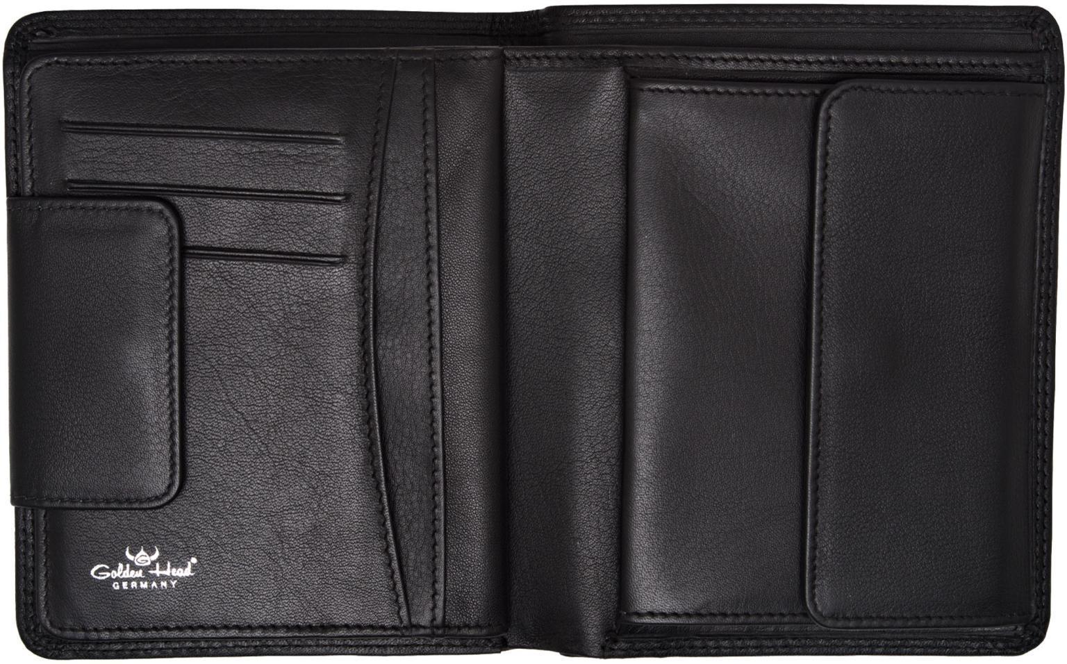 Diese Kombischeintasche mit Münzfach aus der Serie Polo der Marke Golden Head ist aus weichem Rind-Nappaleder mit glattem Finish im klassischem Schwarz (Black) gefertigt. Das anschmiegsame Leder mit Doppelsteppnähte ist von bester Qualität und bietet ein großzügiges Platzangebot. Die Lederbörse mit extra Kreditkarten Einteilung kann mittels Lederzunge und Drücker einfach aufgeklappt werden.