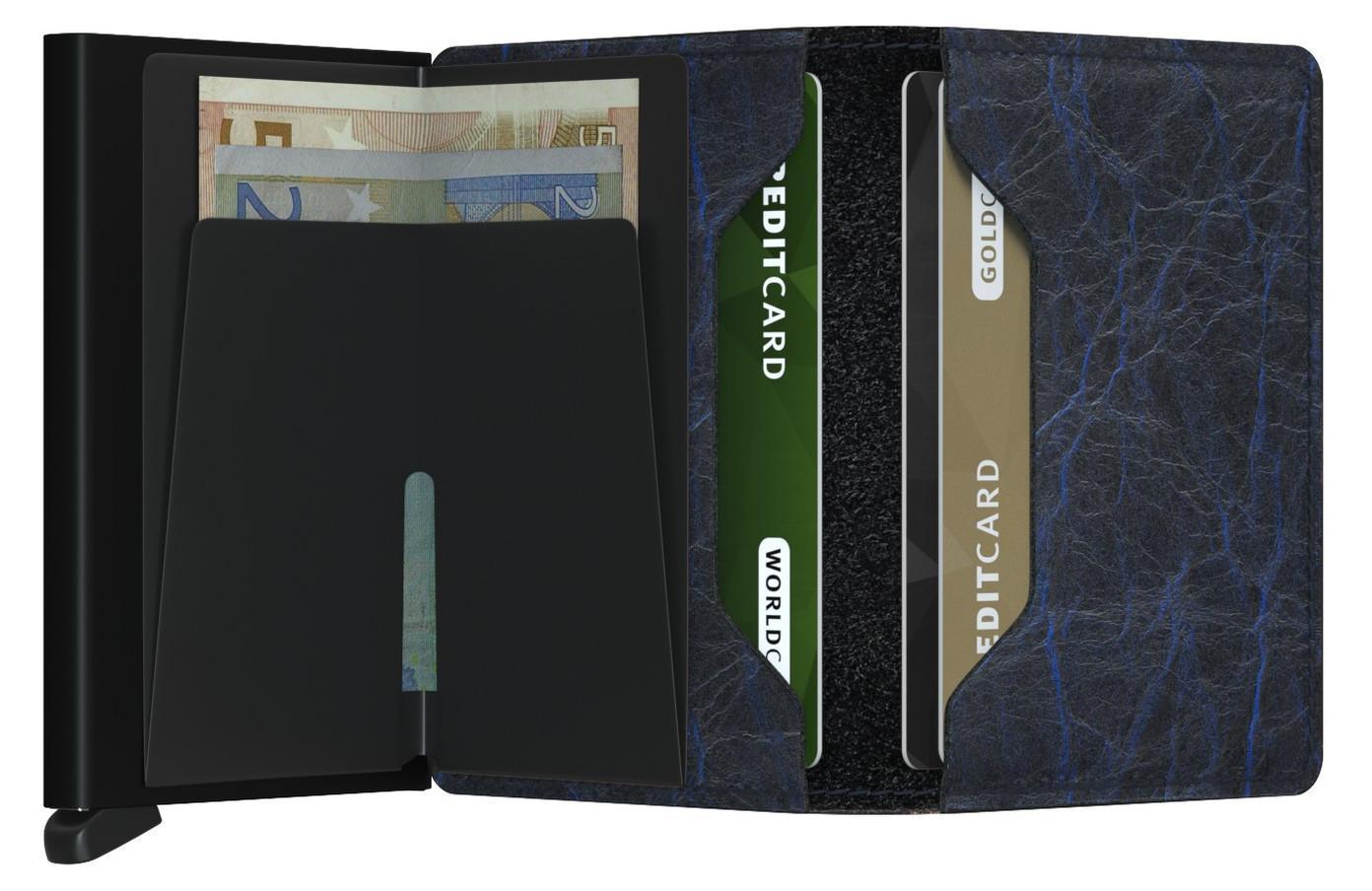 Das praktische Kartenetui Slimwallet Crunch Blue von Secrid ist außen aus hochwertigem strukturiertem Rindleder mit Knitteroptik in schwarz und blau gefertigt. Im Inneren befindet sich eine Hülle aus leichtem Aluminium.