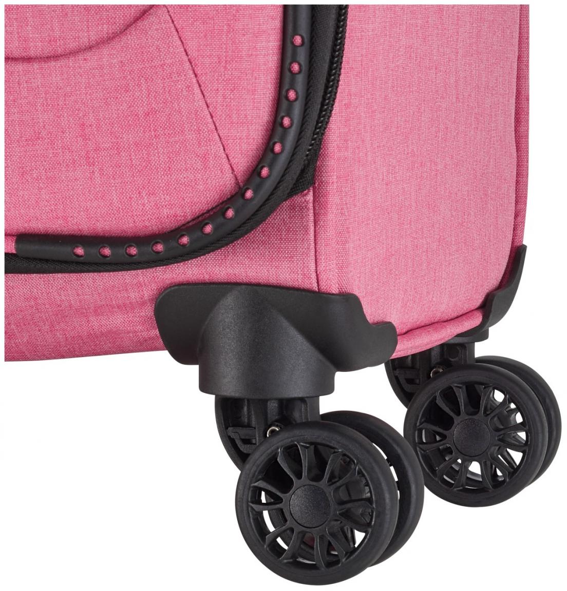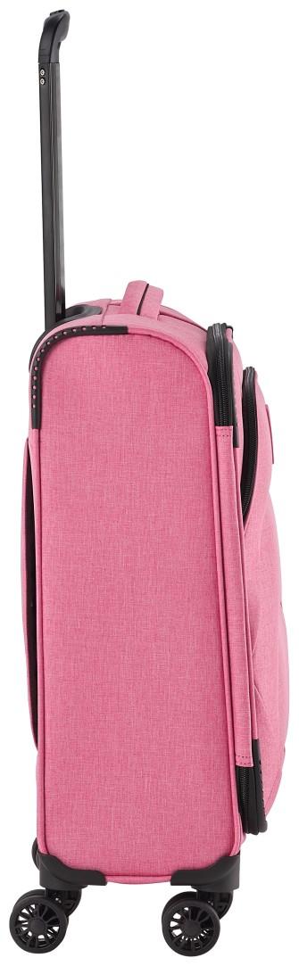 Keine Lust auf langes Suchen des eigenen Koffers auf dem Gepäckband? Dann ist der Handgpäckkoffer 4W Trolley S 55cm aus der SerieAdria von Travelite genau die richtige Wahl. Strapazierfähiges Gewebe in der Farbe Rose (rosa meliert) und das außergewöhnliche Design machen den Rollenkoffer zum echten Blickfang.