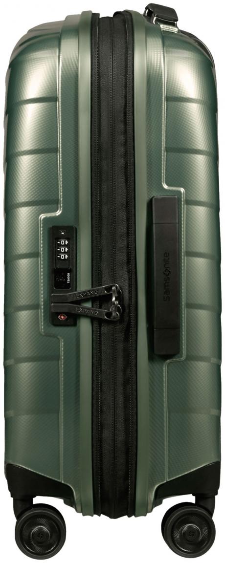 Ein absolutes Leichtgewicht ist der Handgepäckkoffer Spinner 55/20 EXP aus der Serie Attrix von Samsonite. Gefertigt ist der Rollenkoffer aus innovativem Roxkin™-Material im Farbton Basil Green (hellgrün). Dieses besondere Material wurde exklusiv von Samsonite entwickelt und besteht aus 28 Lagen Polypropylen Schalenmaterial. Dadurch ist der Trolley besonders stoßfest und robust, gleichzeitig aber auch äußerst flexibel und leicht.