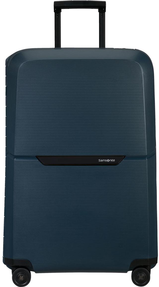 Der Hartschalenkoffer Spinner L 75 cm aus der Serie Magnum Eco von Samsonite ist aus hochwertigem, schlagfestem Polypropylen Schalenmaterial in der Farbe Midnight Blue (dunkelblau) gefertigt. Durch leichte Strukturierung ist die Oberfläche weniger kratzempfindlich als bei anderen Polypropylentrolleys. Der Rollenkoffer ist aus recyceltem Material hergestellt. Dadurch ist der Reisekoffer nicht nur stylisch, sondern schont auch noch die Umwelt.
