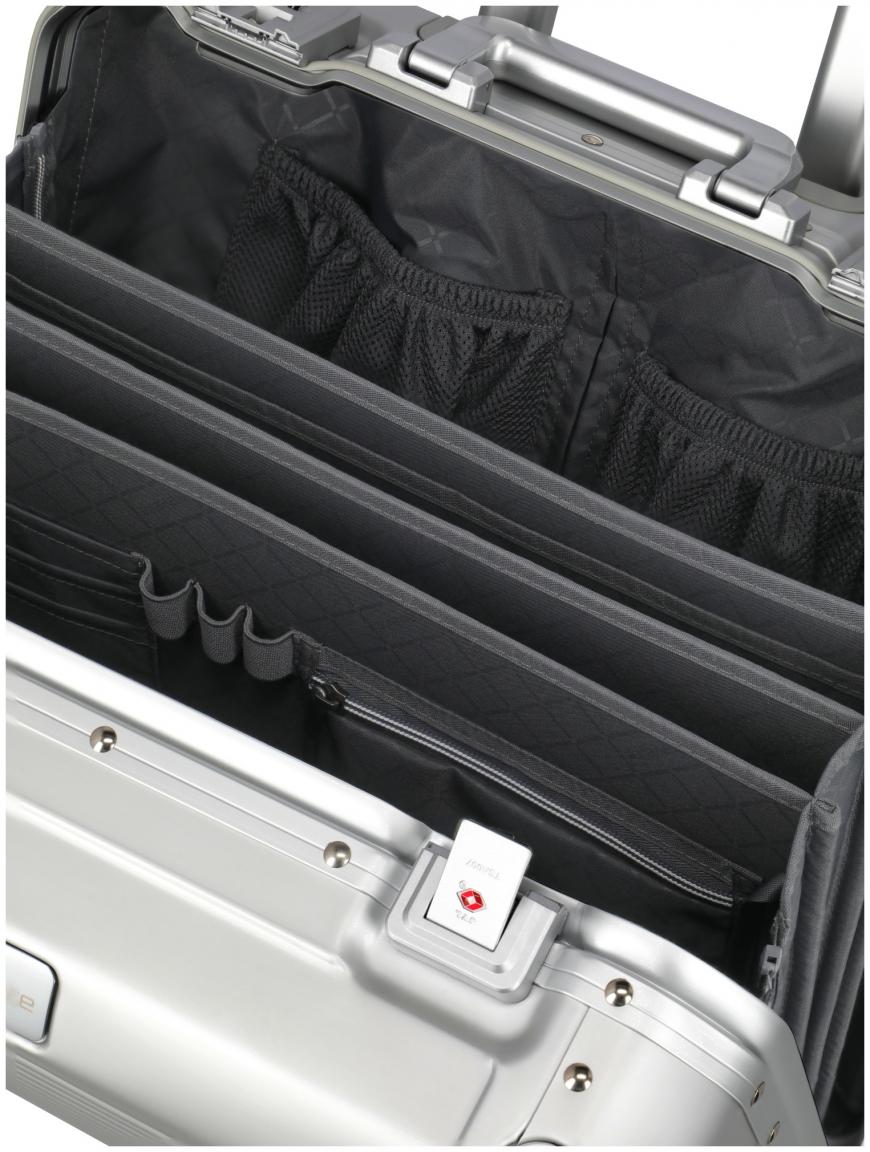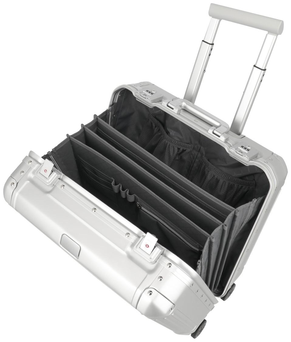 Als praktisches Feature bringt der Metallkoffer eine herausnehmbare Wäschetasche mit. Ebenfalls punkten kann der Businesstrolley mit der durchdachten Inneneinteilung, die mittels Reißverschluss im Koffer befestigt wird.
