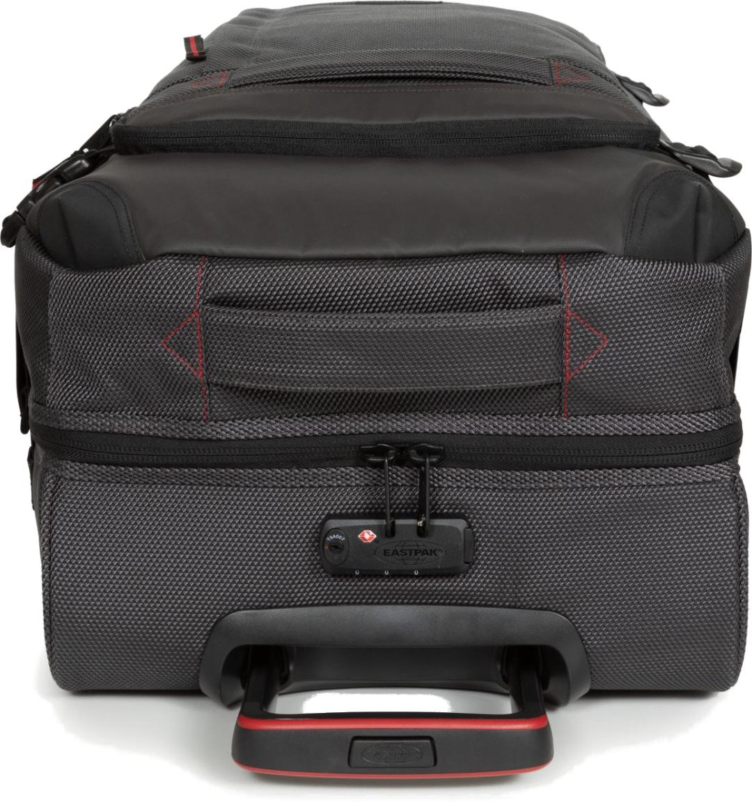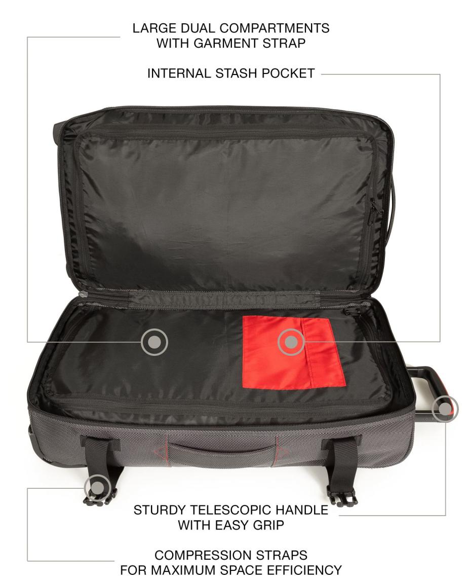 Der Reisetaschen TrolleyTranverz CNNCT M von Eastpak verbindet die Flexibilität von Reisetaschen mit der Übersicht von Koffern und Trolleys und ist damit der ideale Begleiter für längere Reisen. Die Reisetasche im Farbton Accent Grey (Anthrazit) mit roten Details sorgt für eine sportlich elegante Note.