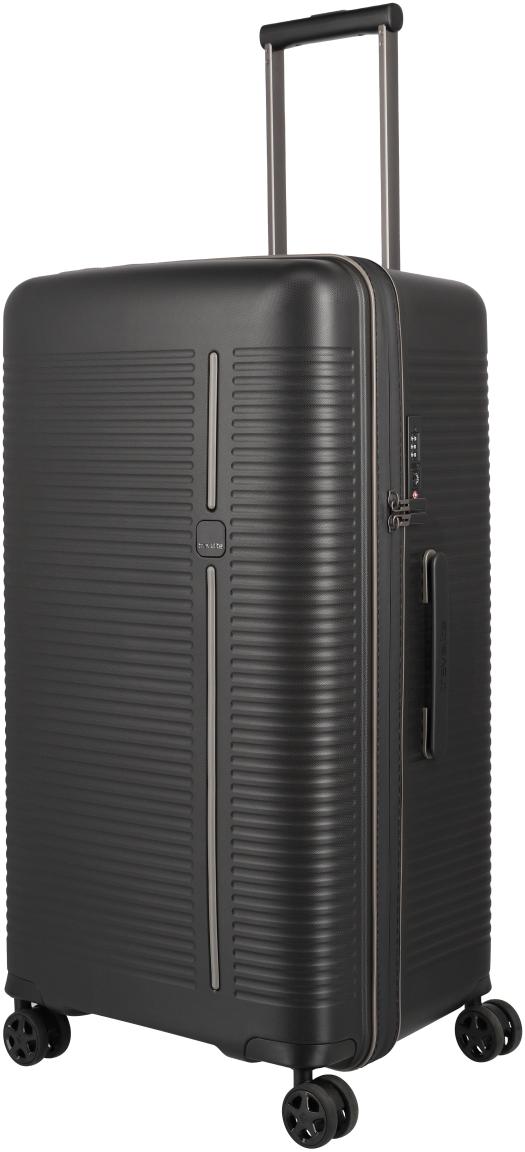 Stilsicher in den wohlverdienten Urlaub geht es mit dem Reisekoffer 4w Trunk L 78cm aus der Serie Roomer von Travelite. Gefertigt ist der Flugtrolley aus besonders widerstandsfähigem Polypropylen in klassischem Schwarz (Black). Die strukturierte Oberfläche macht den Trolley besonders kratzerunempfindlich. Details in Grau sorgen für den sportlich-modernen Look des Hartschalenkoffers.
