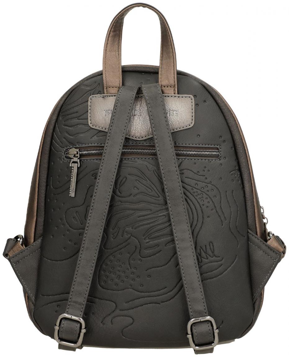 Die Rückseite des Damenrucksacks zeigt eine abstrakte Prägung, in die auch der Markenschriftzug eingearbeitet ist.