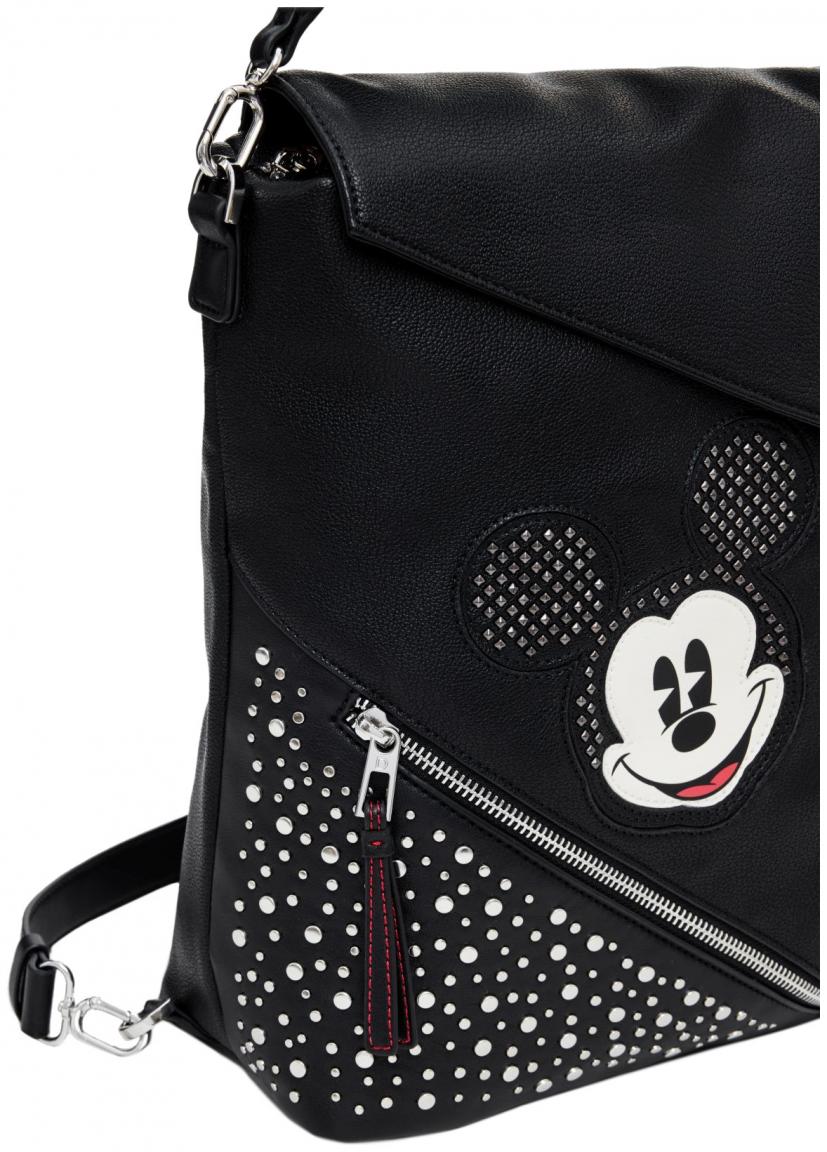 Der Rucksack aus pflegeleichtem Kunstleder bietet zahlreiche Verstaumöglichkeiten, ohne den typischen Rucksackcharakter zu vermitteln. Auf der Vorderseite teilt sich die Mickey - Applikation den Platz mit vielen silberfarbenen Nieten und einem geschickt platzierten Reißverschlussfach. Ein abnehmbarer Anhänger greift das Thema wieder auf.