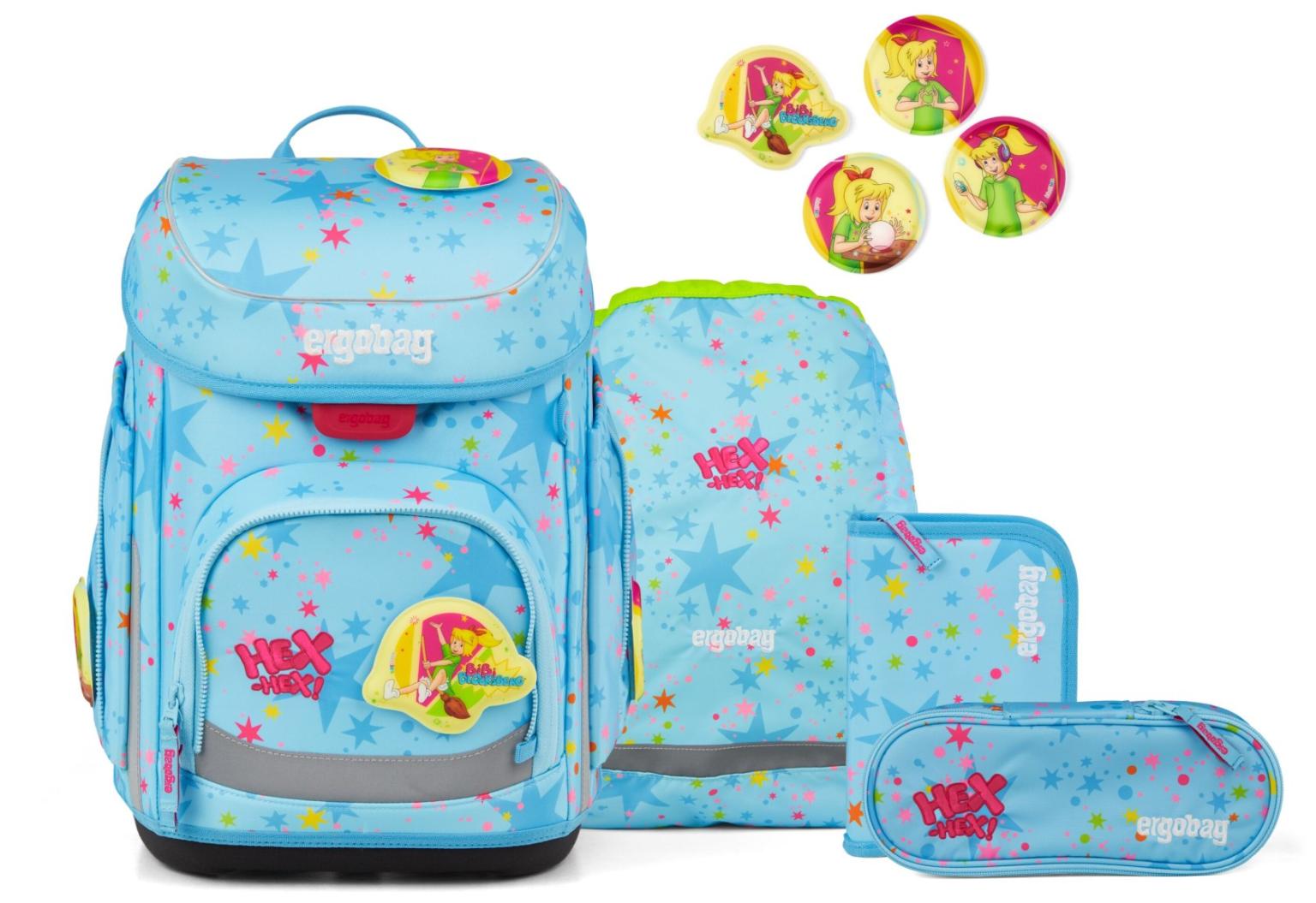 Mit dem kindegerechten Design des 5-teiligen Schultaschensets Cubo Bärhext von Ergobag macht sogar die Schule Spaß. Nicht nur die Farbgebung der Schultasche in Hellblau mit magischem Sterne-Print, auch die vier Kletties mit passenden Bibi-Blocksberg-Motiven sorgen sofort für gute Laune. Komplettiert wird das Rucksackset mit befüllter Federmappe, Schüttelpennal und Sportbeutel. Perfekt für alle kleinen Hexen und Zauberer!