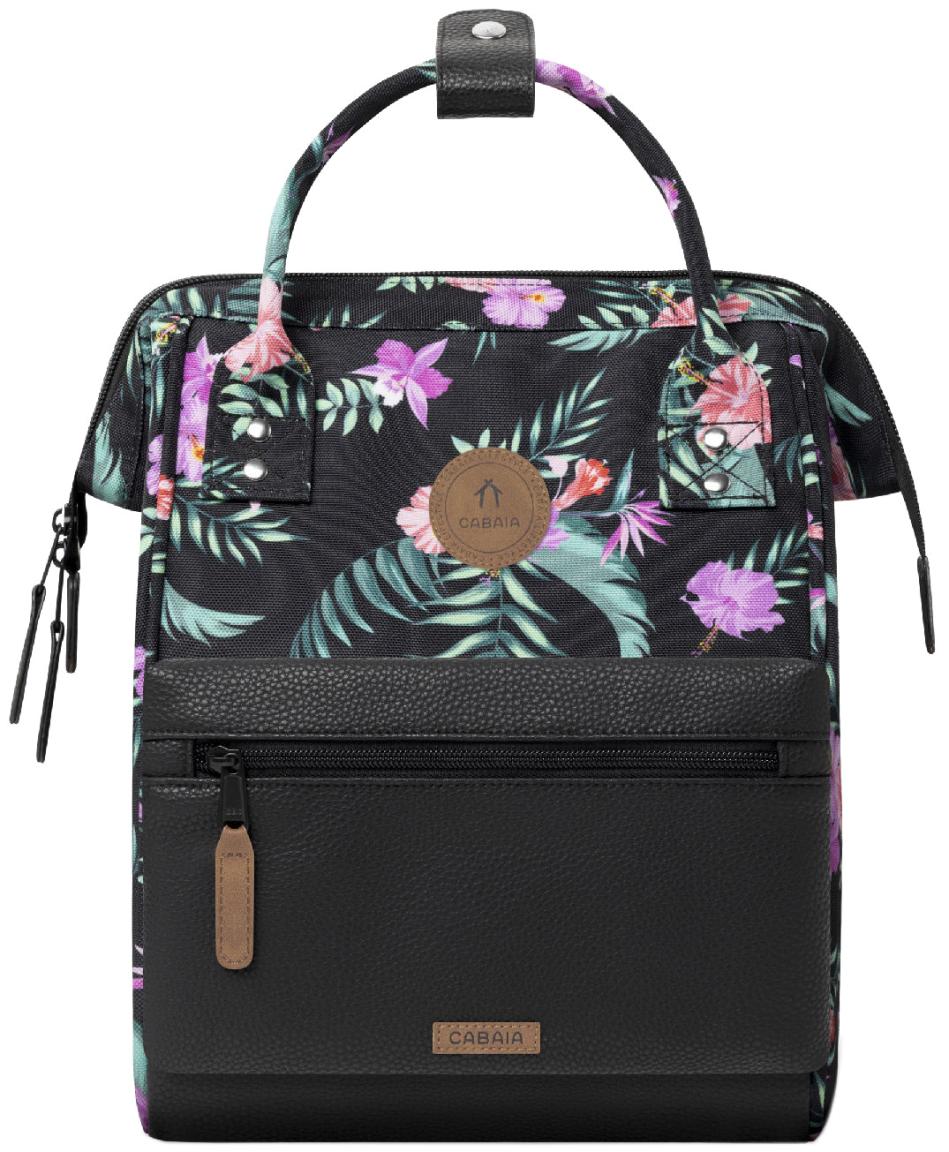 Gefertigt ist der Mädchenrucksack im Design Valladolid aus dichtem Gewebe in Schwarz mit einem bunten Muster aus Hibiskus und Blättern. Das nachhaltig produzierte Nylongewebe wurde aus Plastikflaschen gewonnen.