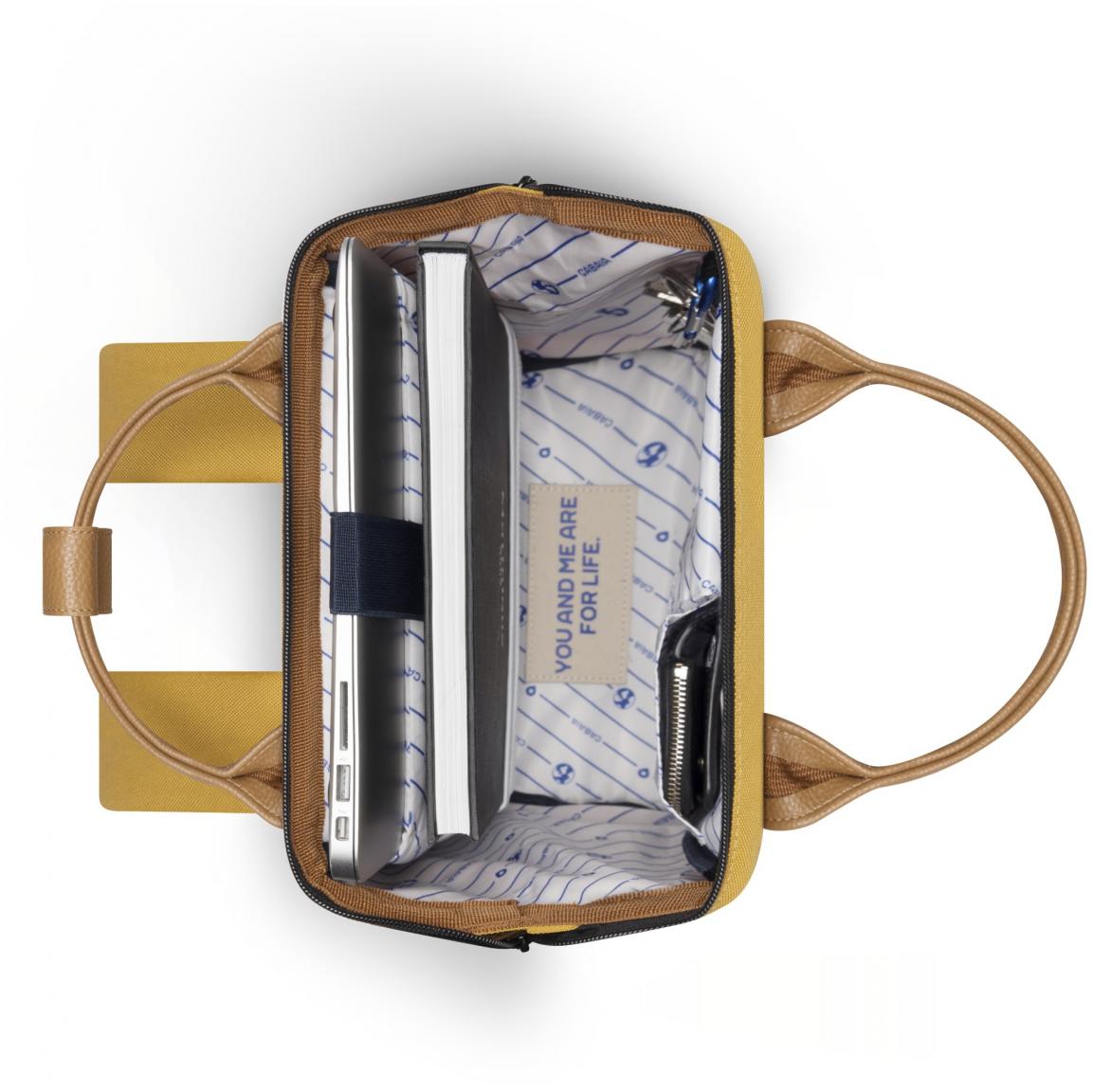 Gefertigt ist der Rucksack im Design Guadalupe aus dichtem Gewebe in trendigem Senfgelb (Ocher). Details aus braunem Kunstleder sorgen für den sportlichen Look des Minirucksacks.
