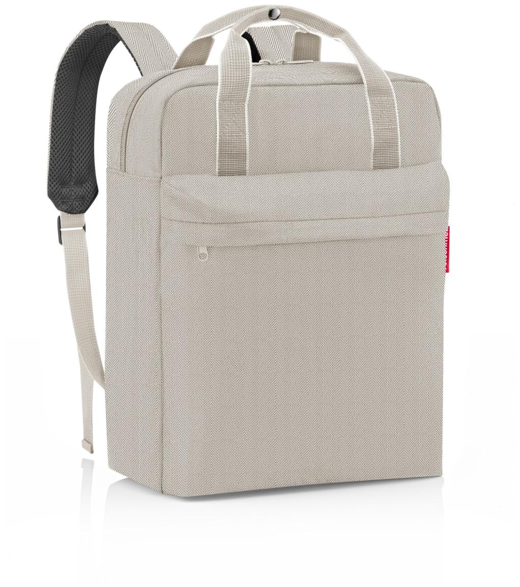 Praktisch im Alltag und auch auf Reisen ist der Laptoprucksack Allday Backpack M von Reisenthel. Gefertigt ist der Rucksack aus dichtem Gewebe im Design Herringbone Sand (hellbeige mit Fischgrät-Optik).