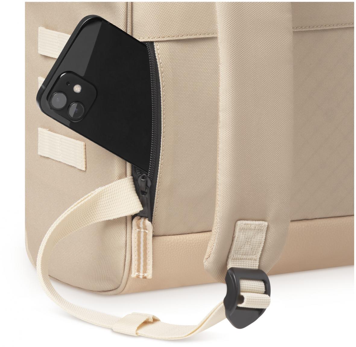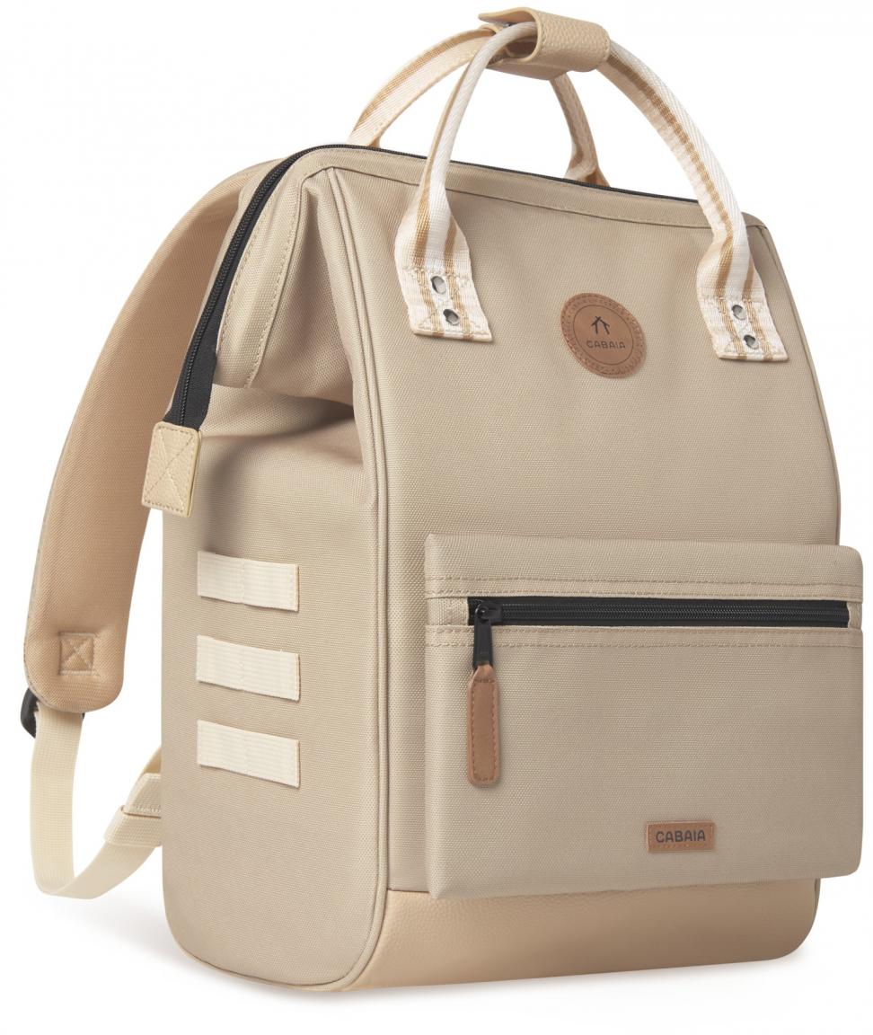 Der Freizeitrucksack im Design Lobito zeigt sich in hellem Beige (Cream). Details aus veganem Kunstleder und gestreiftem Gurtband sorgen für den modernen und ungewöhnlichen Look des Backpacks.