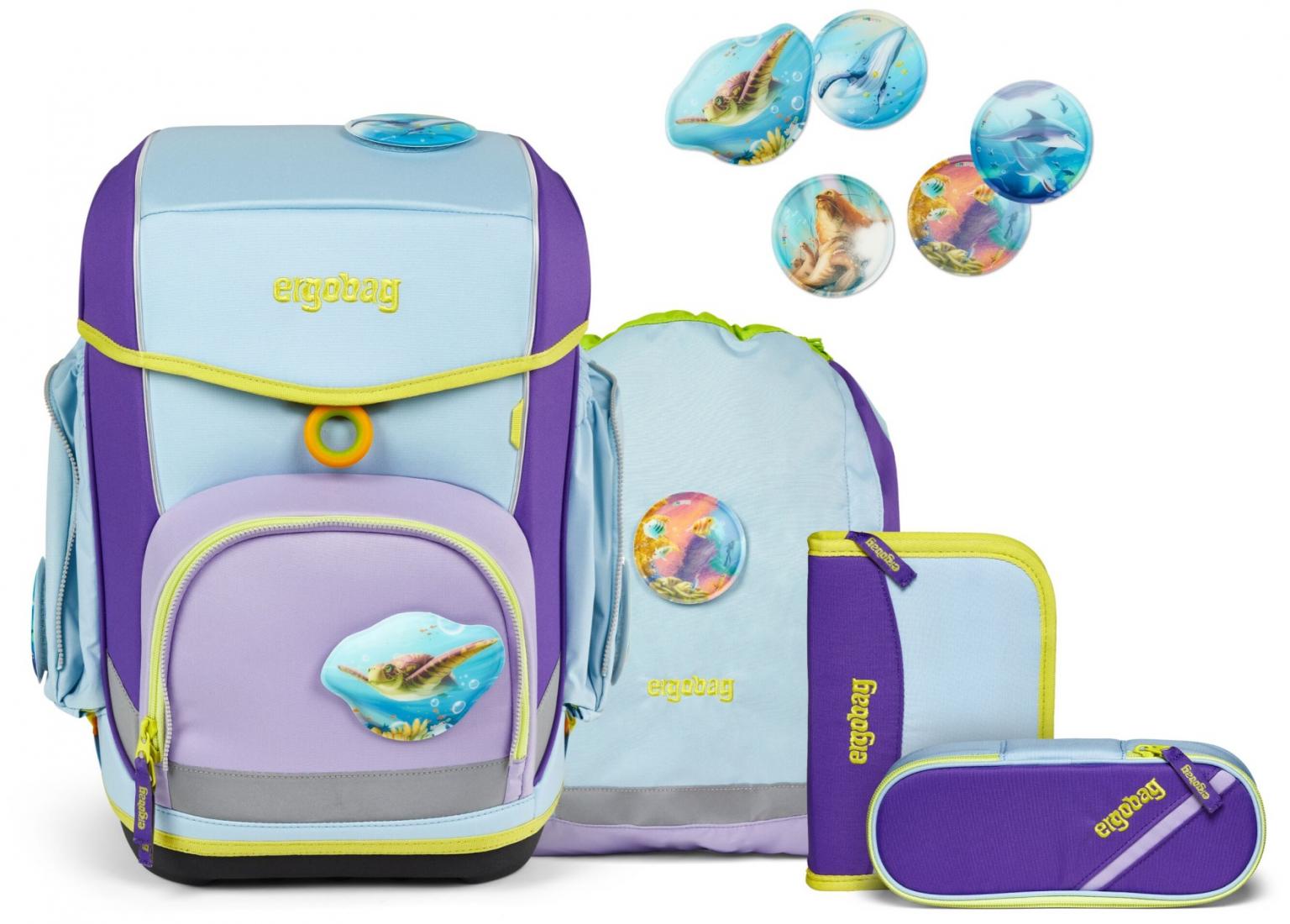 Mit den kräftigen und frischen Farben des 5-teiligen Schultaschensets Cubo TauchBär von Ergobag macht sogar die Schule Spaß. Nicht nur die auffällige Farbgebung der mitwachsenden Grundschultasche in Blau und Lila, auch die fünf Kletties mit passenden Unterwasser-Motiven sorgen sofort für gute Laune. Komplettiert wird das Rucksackset mit befüllter Federmappe, Schüttelpennal und Sportbeutel.
