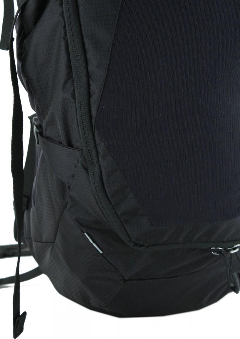 Am Hüftgurt befinden sich beidseitig Reißverschlusstaschen, eine davon mit ausklappbaren Flaschenhalter. Der großzügige Zugang zum Hauptfach ist  mit einem praktischem 2-Wege-Reißverschluss ausgestattet und bietet einen hervorragenden Zugriff auf das Gepäck.
