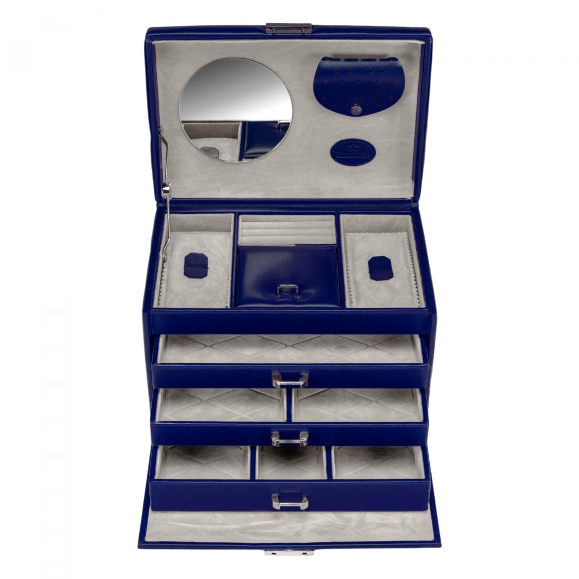 Einen sicheren und schonenden Aufbewahrungsort für den wertvollen Schmuck bietet Windrose mit diesem Schmuckkoffer aus der Kollektion Merino Moda. Gefertigt ist die Schatulle aus weichem, authentisch genarbtem Feinsynthetik in dunklem Blau. Die gesamte Box ist mit einem samtig weichen Futter in hellem Grau ausgestattet.