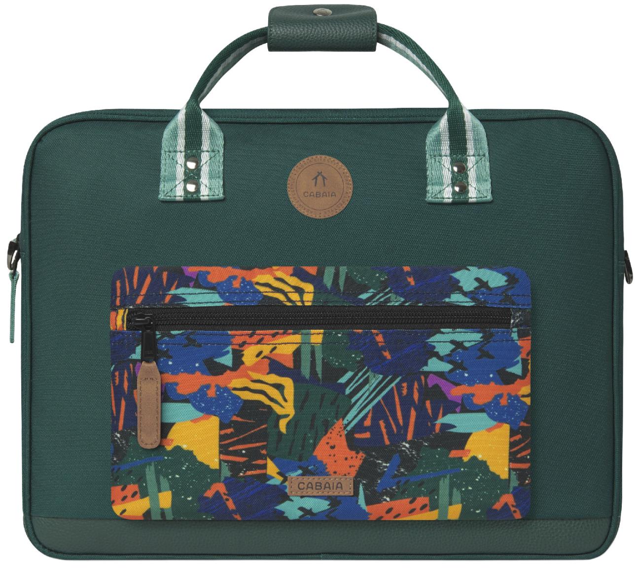Der Clou an dieser nachhaltigen Businesstasche ist die austauschbare Fronttasche. Diese wird einfach mittels Gurten und Druckknöpfen an der Vorderseite befestigt und kann, wenn ein anderer Style gewünscht ist, einfach ausgewechselt werden. Eine Fronttasche in Grün und eine bunt gemustertes Wechselpouch bringt die Collegetasche gleich mit.