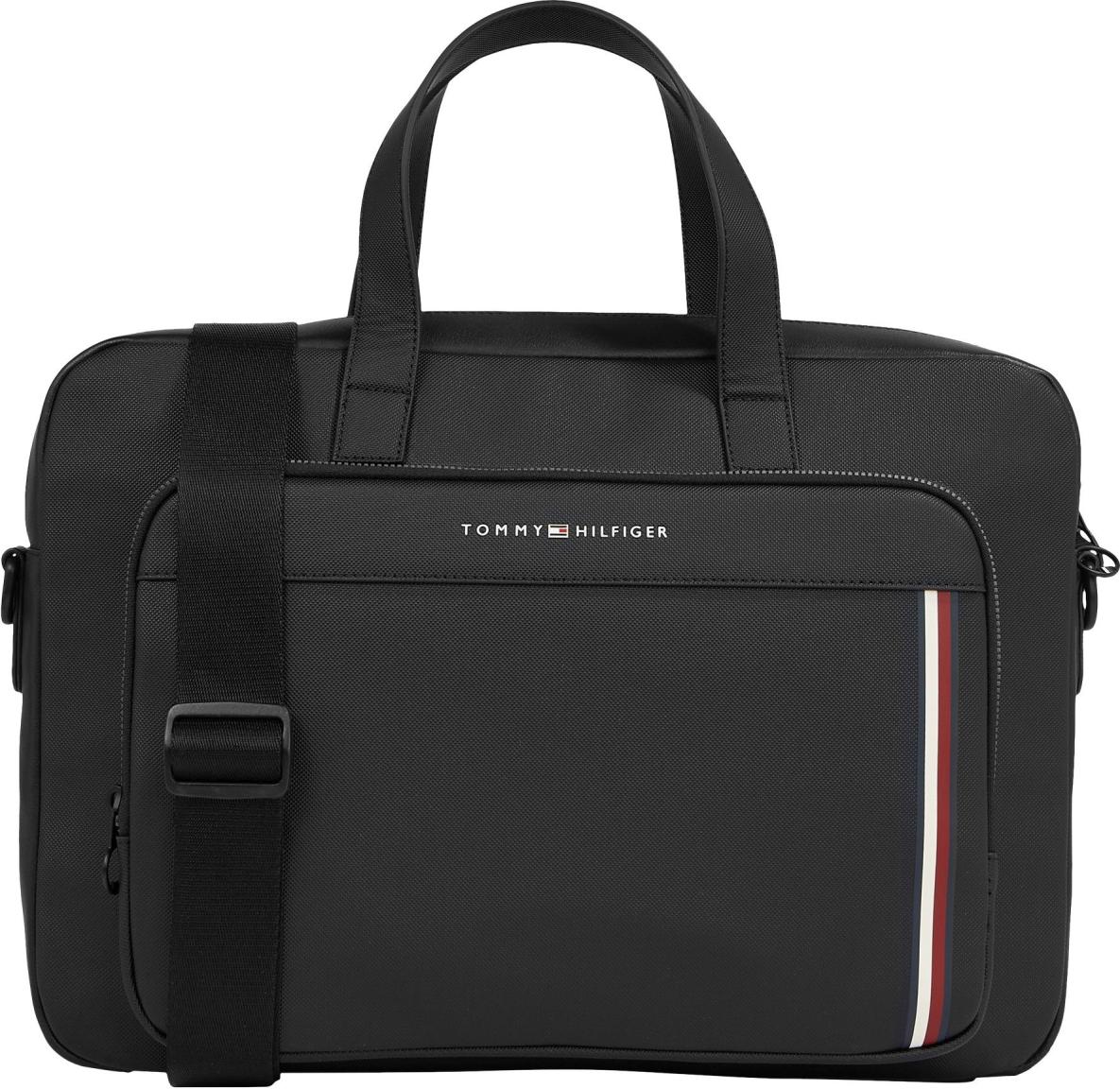 Dieser Business Computer Bag von Tommy Hilfiger aus der Serie TH Pique Slim ist aus hochwertigem leicht strukturierten Lederimitat in der Farbe Black (schwarz) gefertigt. Ein metallener Markenschriftzug findet sich präsent auf der Taschenvorderseite und verleiht der edlen Herren Aktentasche den gewissen Flair.