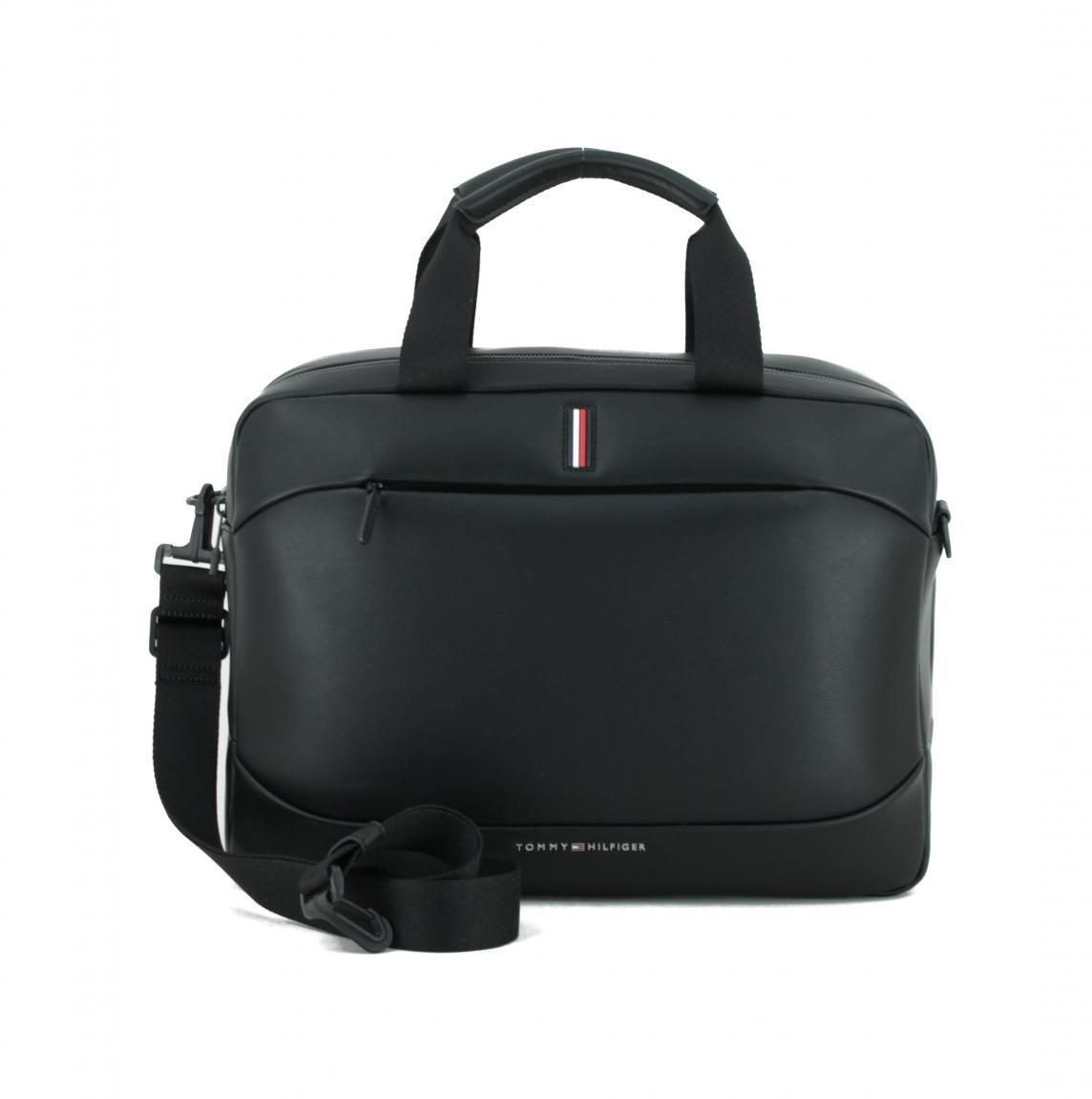 Dieser geräumige Computer Bag von Tommy Hilfiger aus der Serie Metro 48 Hours Bag ist aus hochwertigem PU-Material in der Farbe Black (schwarz) gefertigt. 50% Recyclingmaterial wurden hier der Umwelt zuliebe verarbeitet, und wirkt auch noch sehr stylisch. Markenstips in den typischen Farben und auch das Markenemblem zieren die Taschen Vorderseite.