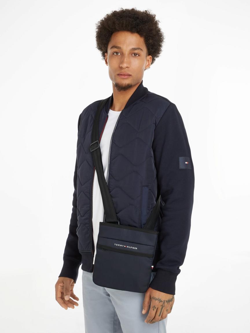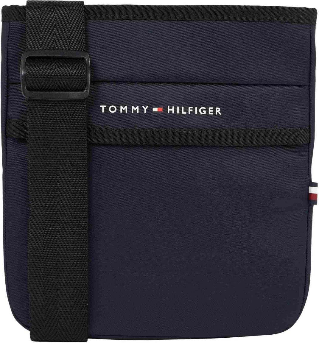 Die schmale Crossover Männertasche der Marke Tommy Hilfiger aus der Serie Skyline Mini Crossover ist aus robustem Nylon in der Farbe Space Blue (Blau) gefertigt. Ein weißer Markenschriftzug ist an der Taschenvorderseite platziert. Unterhalb befindet sich ein durch einen schmalen Überschlag geschütztes Reißverschlussfach.