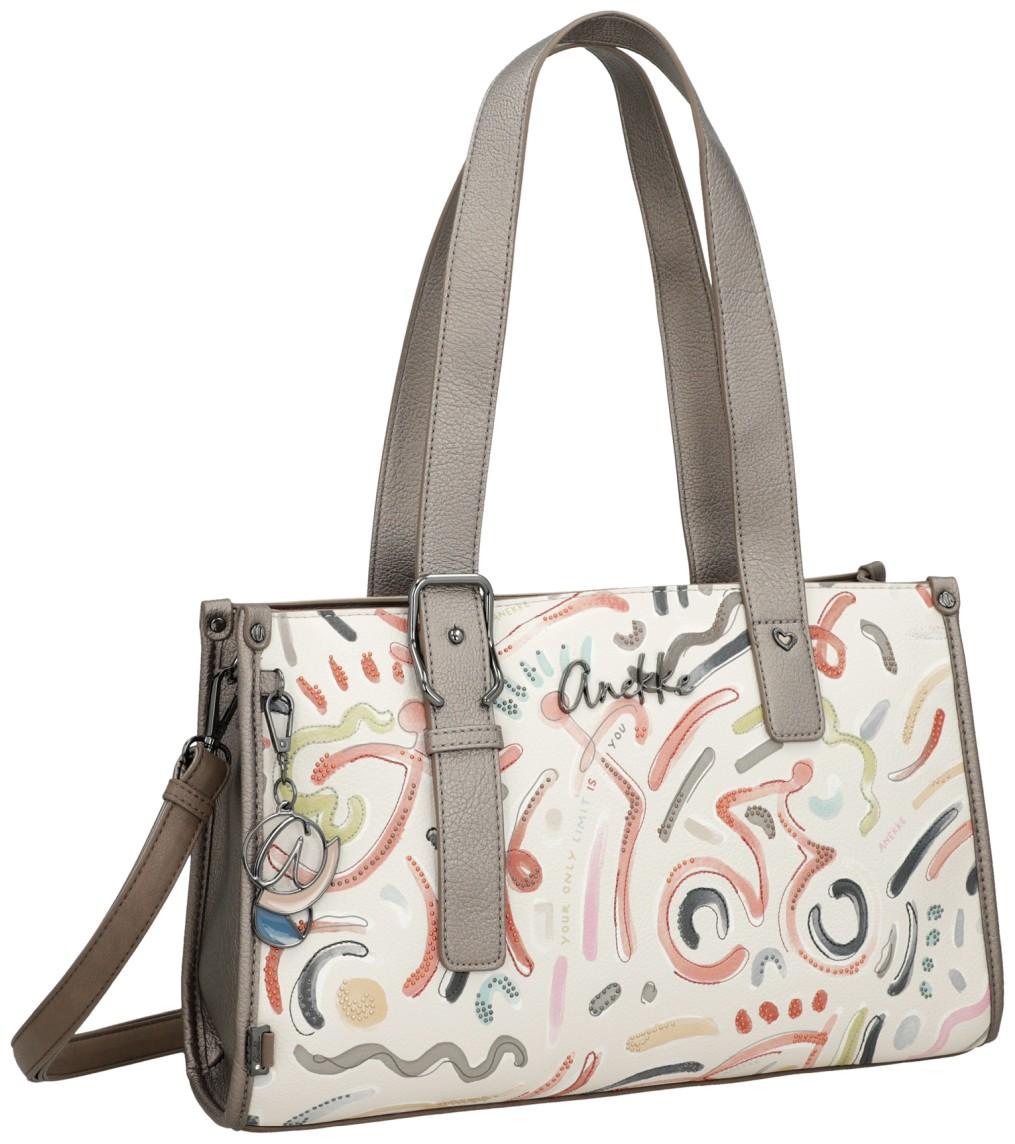 Die Vorderseite dieser Handtasche ist aus genarbtem Kunstleder in hellem Nude-Ton gefertigt. Der stilisierte Print zeigt neben angedeutete Bewegungen sportliche Aktivitäten, wie Radfahren, Sprinten, Springen usw.... Die Schultertasche überzeugt mit den farbenfrohen Prints, farblich abgestimmten Ziernieten und metallic bronzefarbenen Akzenten.