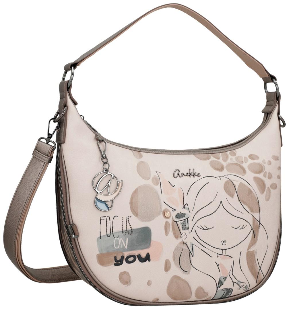 Die Vorderseite dieser Beuteltasche ist aus genarbtem Kunstleder in hellem Nude-Ton gefertigt. Das charakteristische Motiv - lediglich in Konturen auf die Tasche gestickt - zeigt Anekke, die selbstbewusst die olympische Fackel hochhält. Betont wird das Portrait durch funkelnde Strasssteine und einen abstrakten, aquarellartigen Print. Mit dem Statement 'Focus on you' fordert uns Anekke auf, uns ganz auf uns selbst zu konzentrieren.