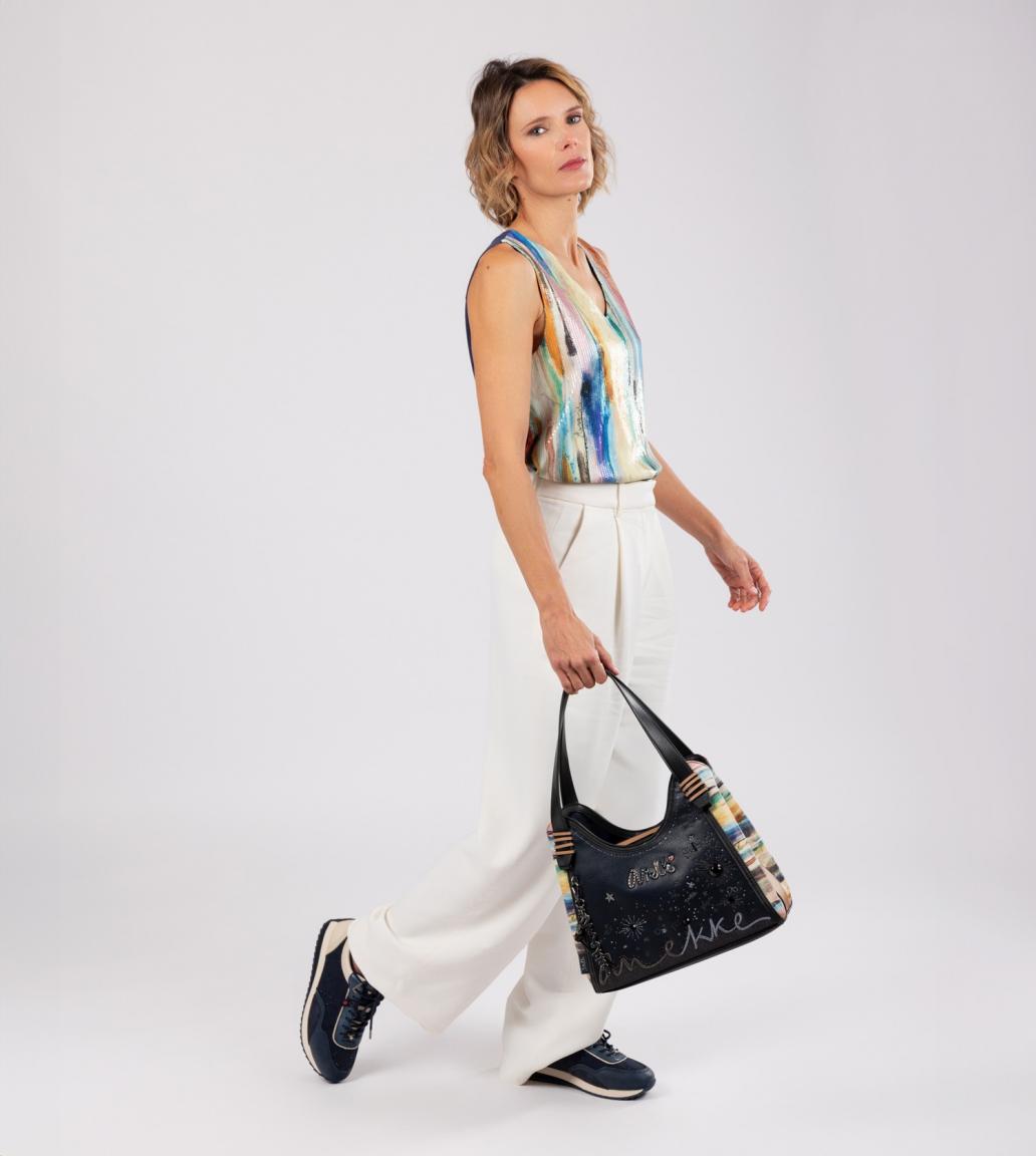 Anekke präsentiert uns eine Schultertasche im verträumten Stil. Das dunkelblau der Studio Navy Linie aus der Hollywood Kollektion erinnert an einen dunklen Nachthimmel, erleuchtet durch Sterne. Ein kleine Wink in Richtung der Stars und Sternchen aus Hollywood.