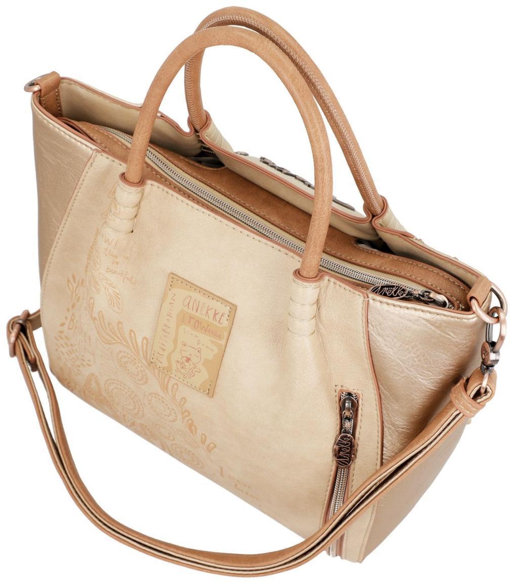Die Tragetasche aus der Serie Mediterranean der Marke Anekke ist aus hochwertigem Lederimitat mit süssem Print gefertigt. Das angenehm weiche und auch sehr leichte Material punktet mit glanzvoller Aufmachung, wie auch die abgesetzten Kanten mit besonderen Nähten an den Seiten und der aufwendigen leicht gerafften Taschenöffnung. Die raffinierte Lösung mit den Kurzhenkeln rundet das Design hervorragend ab.