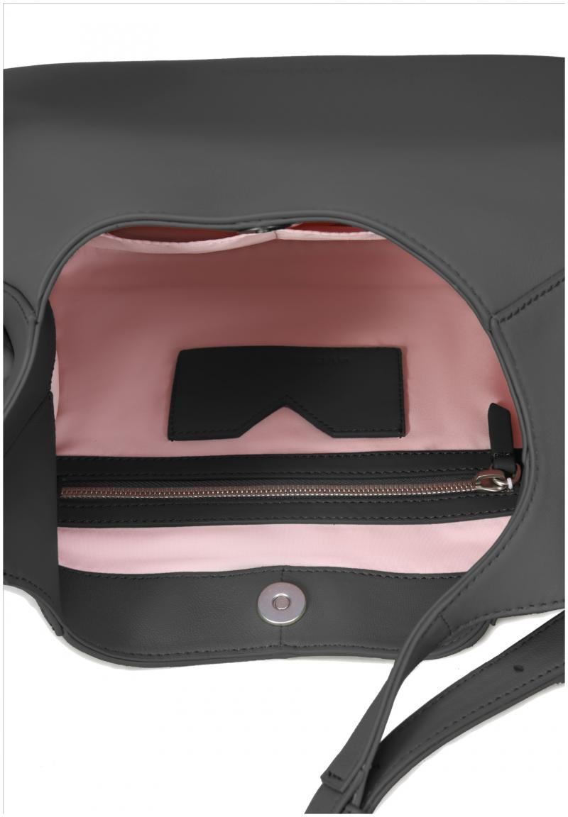Das Hauptfach der Beuteltasche wird mittels Magnetdrücker geschlossen. Im Inneren ist die Hobo Bag komplett mit einem hellrosa Textilfutter ausgestattet.