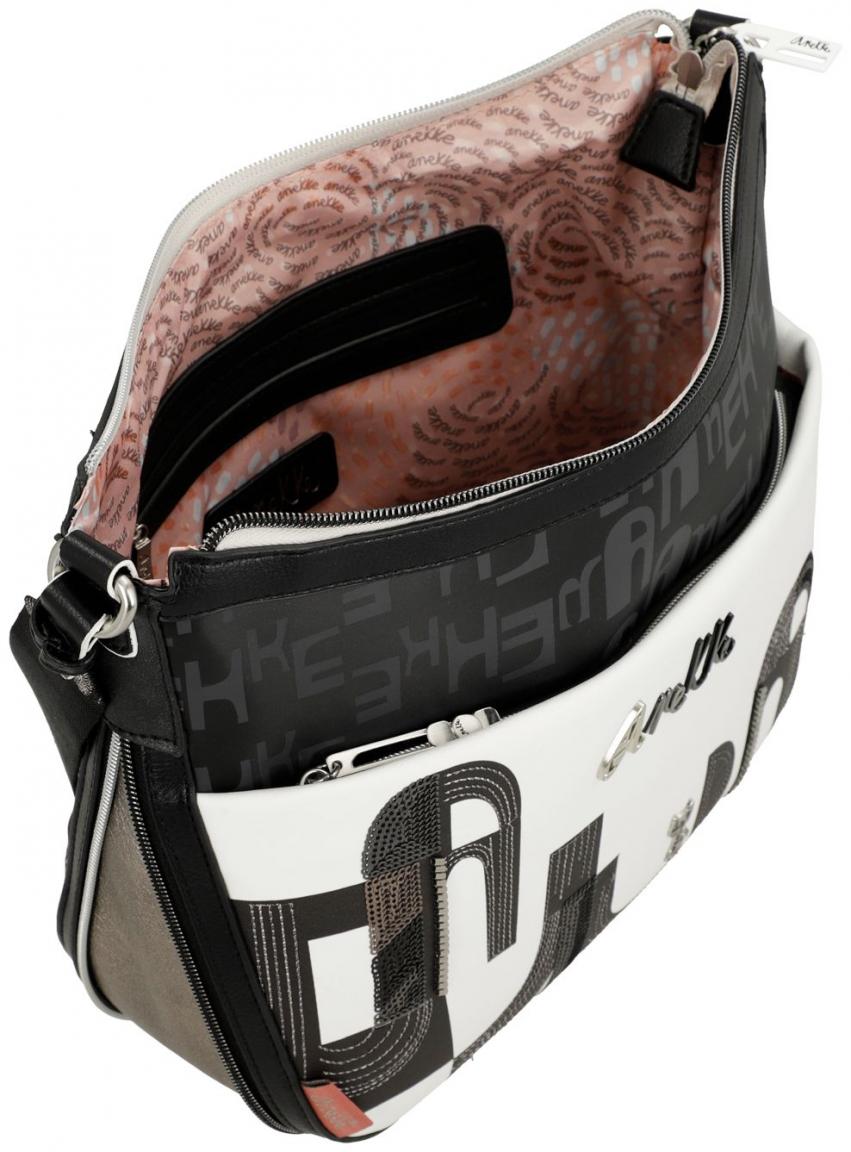 Der abstrakt und modern anmutende Print an der Vorderseite dieser Umhängetasche in Schwarz auf weißem Kunstleder symbolisiert die außergewöhnliche Architektur. Auch im dreifarbig gestalteten Markenemblem sind die Strukturen des Prints zu erkennen.