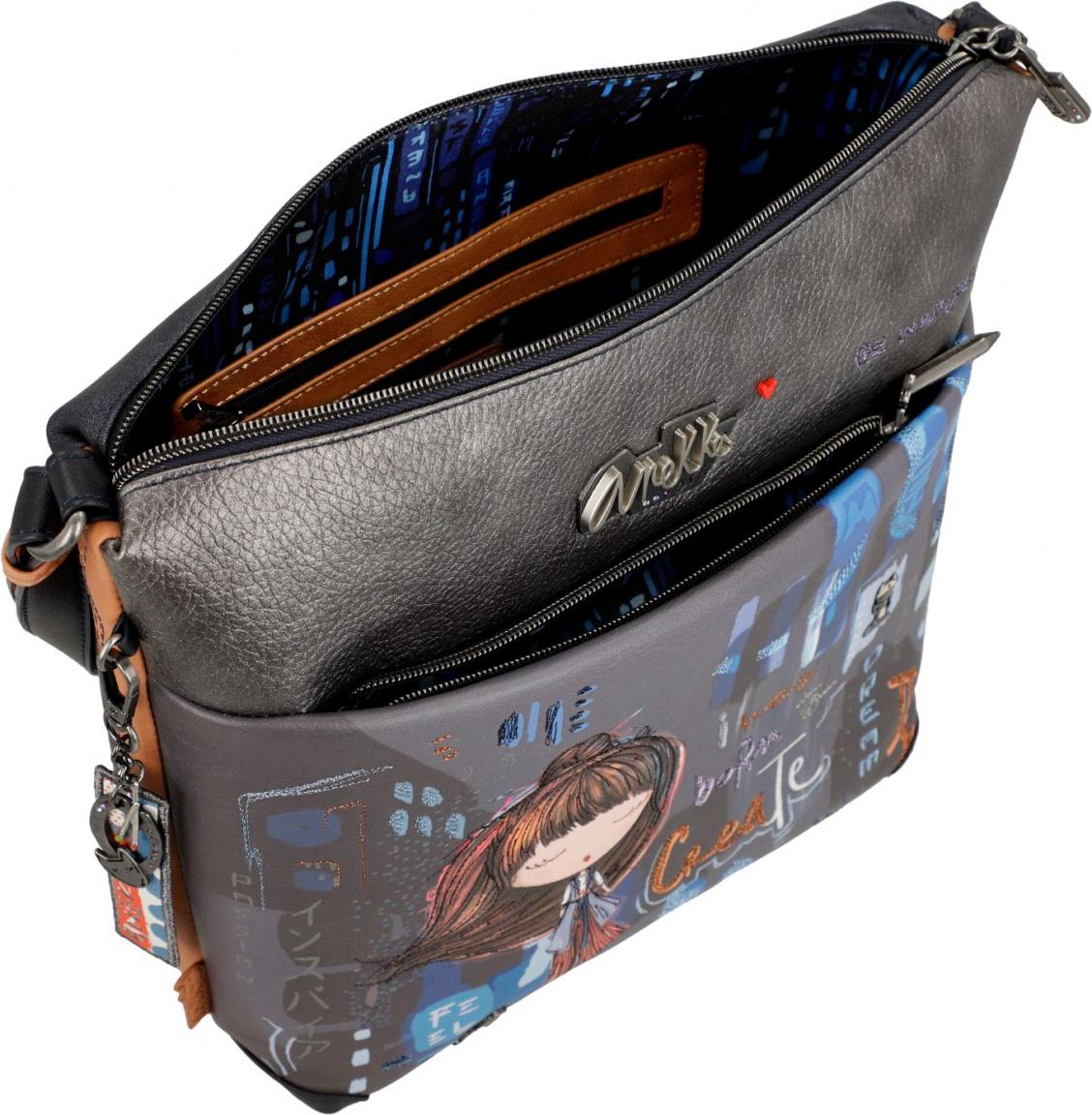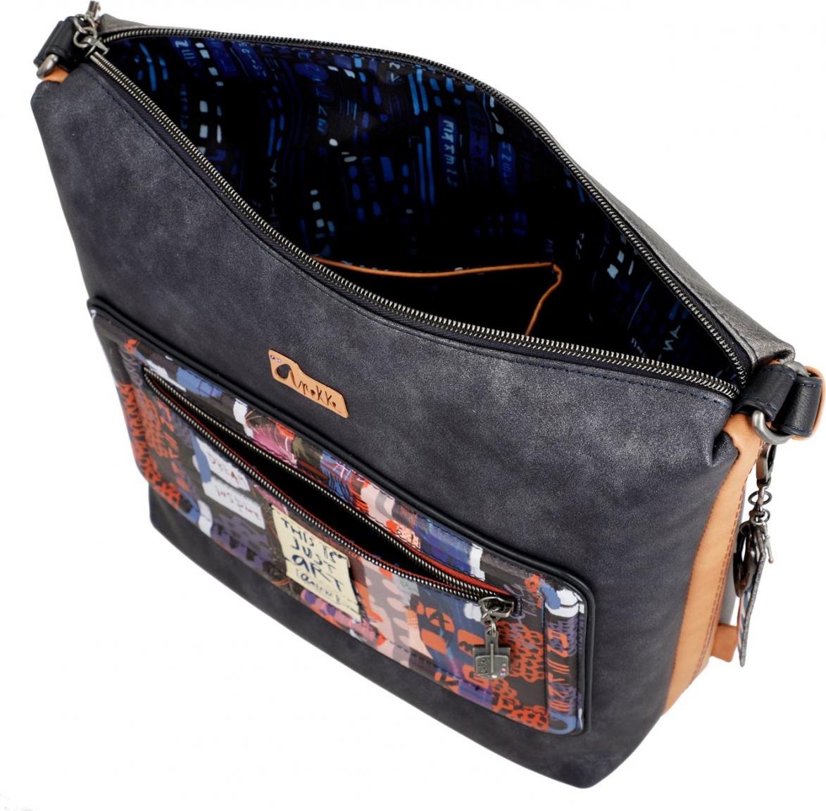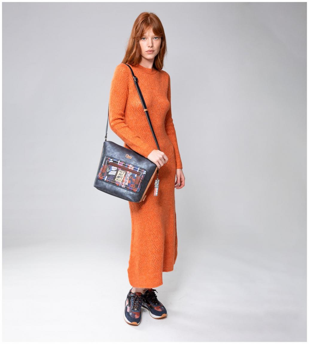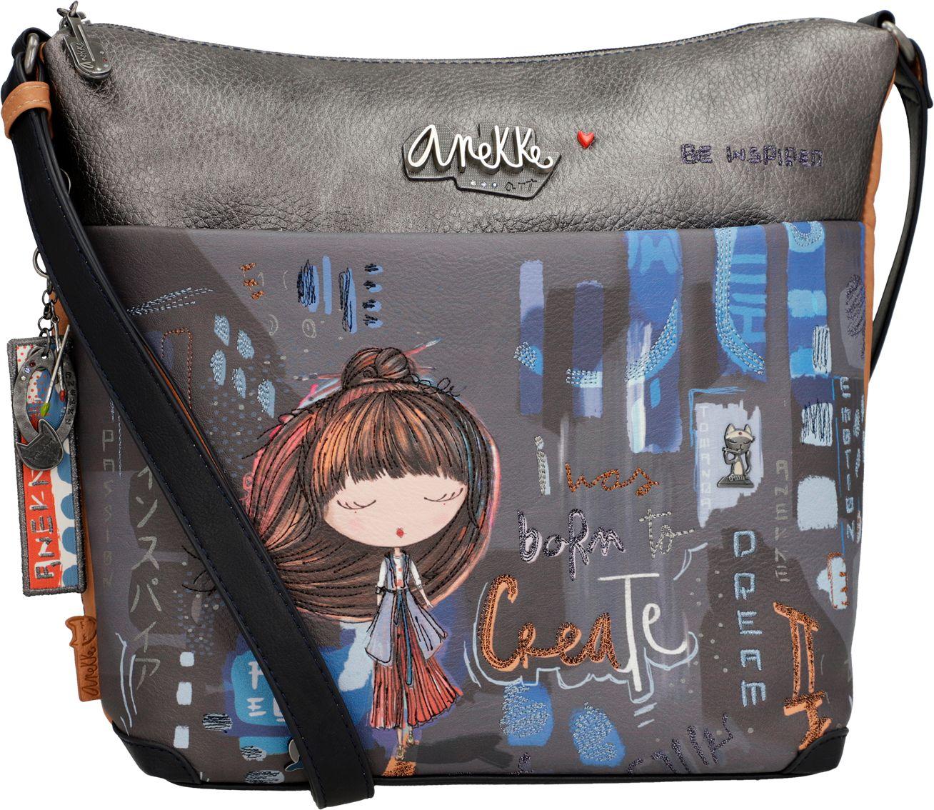 Die Vorderseite der Schultertasche aus blauem Kunstleder zeigt den charakteristischen Print mit einer verträumten Anekke in der nächtlichen Stadt - stilisiert dargestellt durch glitzernde Stickereien und abstrakte Formen in kräftigen Farben. Ein modern gestaltetes Markenemblem passt sich hervorragend dem Design der Umhängetasche an.