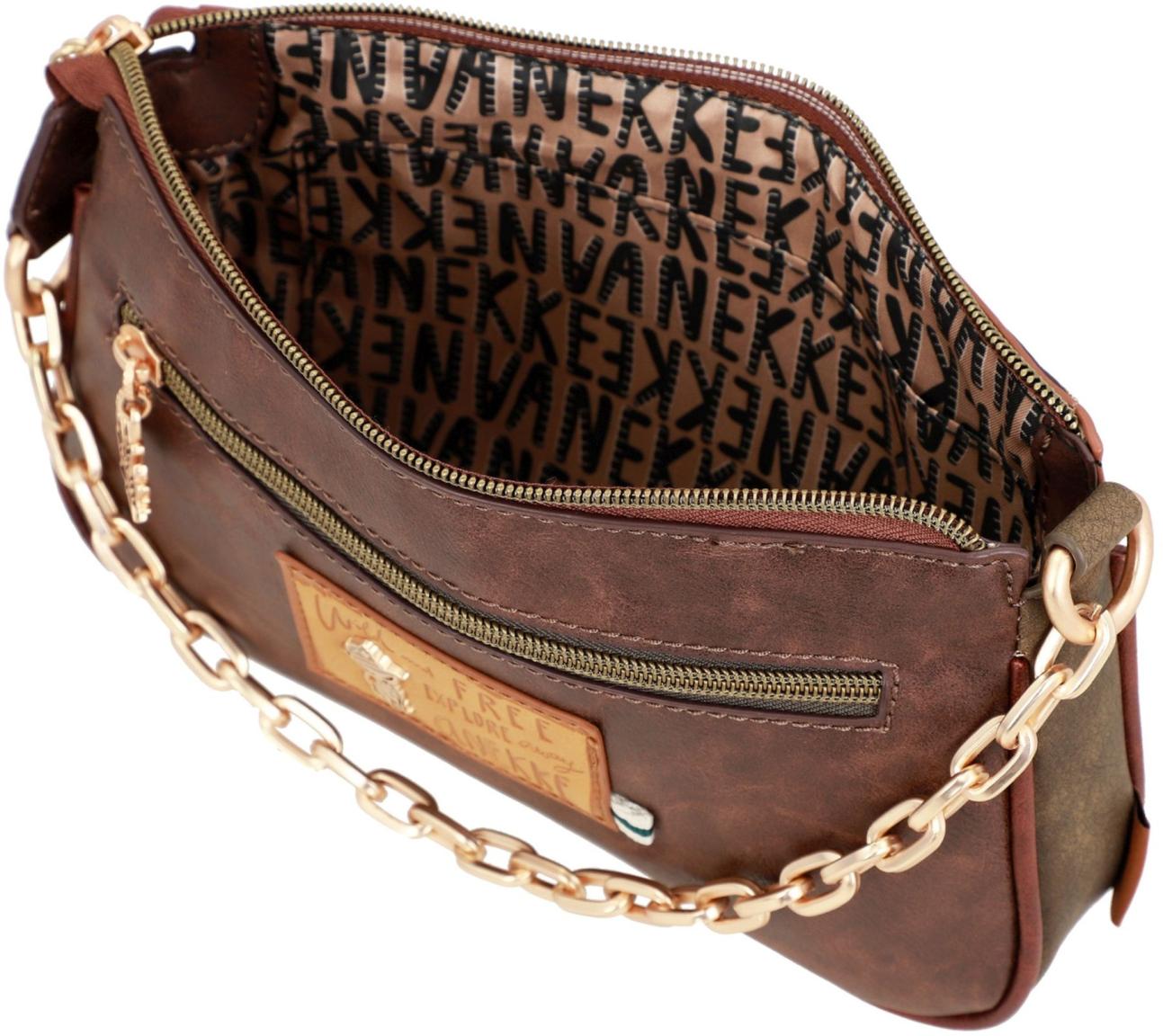 Dass es in Kanada nicht nur Wälder und Wildnis gibt, zeigt uns Anekke mit der Linie Urban aus der The Forest Kollektion. Die kleine Crossbody Bag auch Lederimitat in warmen Brauntönen folgt dabei dem angesagten Logomania-Trend. Die gesamte Vorderseite der Umhängetasche ist dabei mit dem Schriftzug bedruckt. Die applizierten grünen Streifen an der Vorderseite der Chainbag bilden einerseits einen Kontrast, fügen sich aber dennoch hervorragend in das herbstliche Design ein.