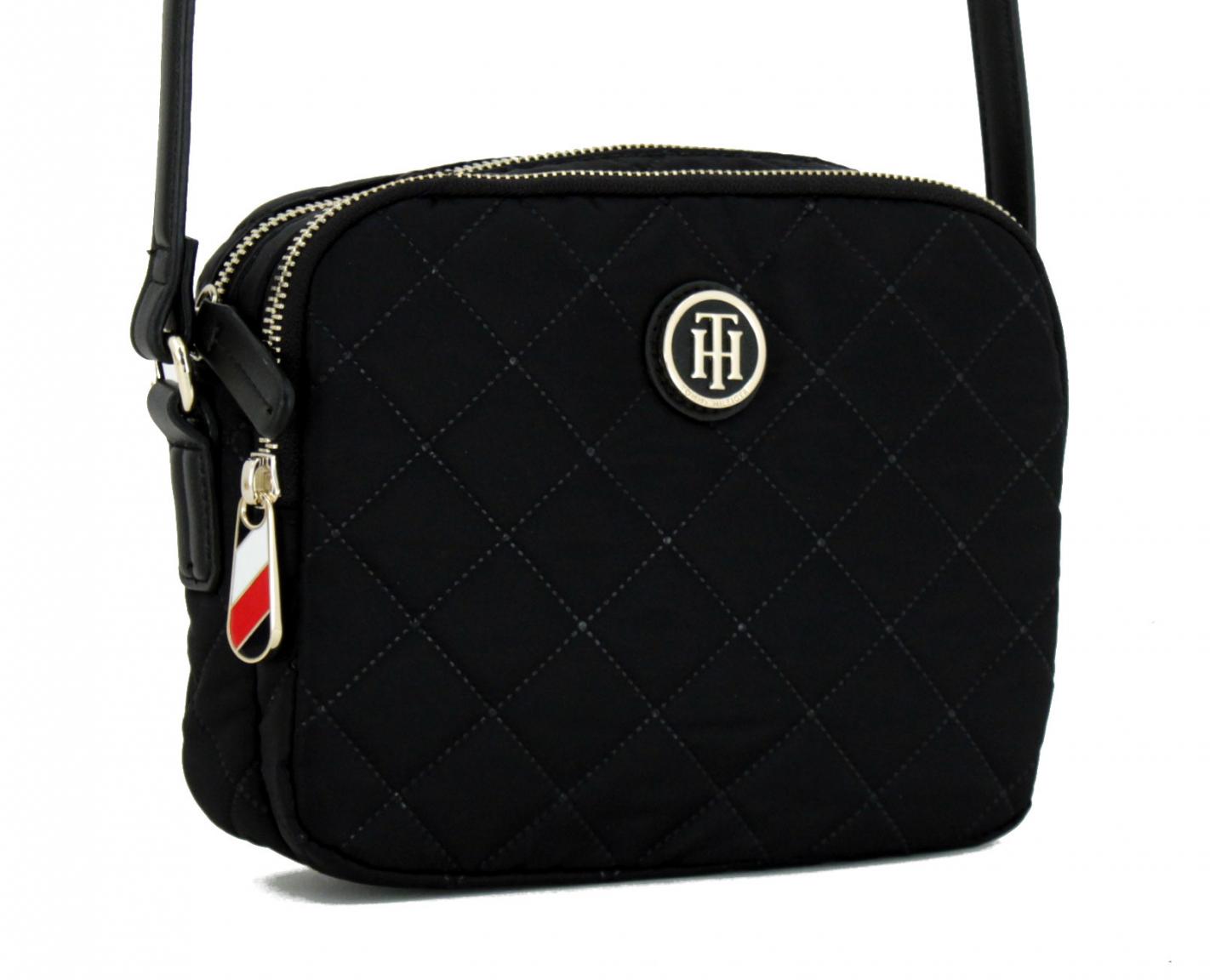 Diese Umhängetasche aus der Serie Poppy Crossover von Tommy Hilfiger ist aus Nylon mit Details aus schwarzem Kunstleder gefertigt. Die gesamte Schultertasche ist mit einem Rautenmuster verziert.