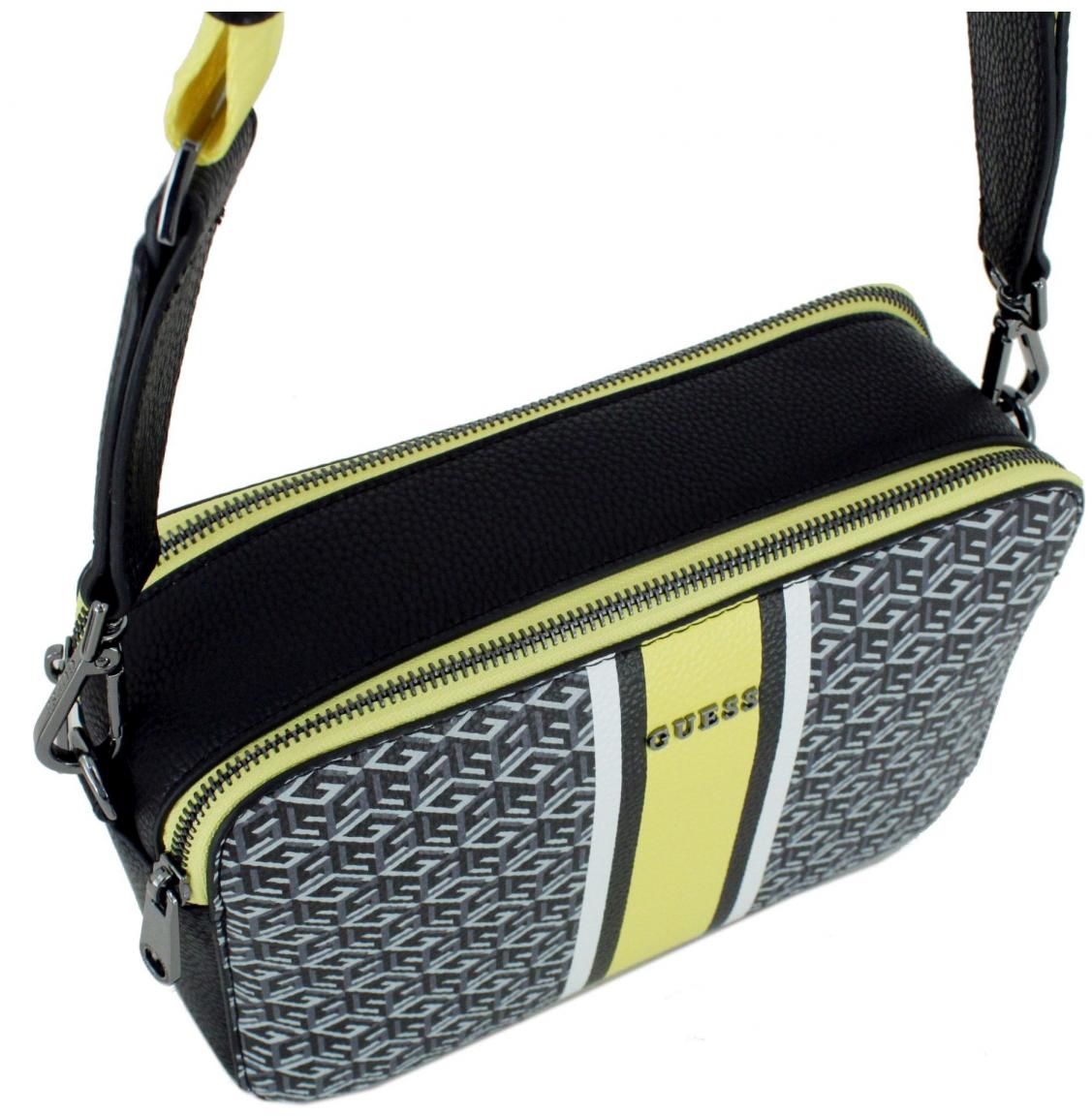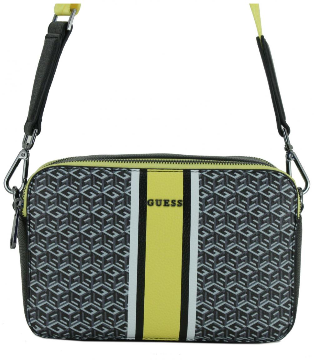 Ein richtiges Fashion-Statement setzt die Camera Bag aus der Serie Rainee von Guess. Gefertigt im Design Black Logo/Yellow zeigt die Umhängetasche einen außergewöhnlichen 3D-Logoprint in verschiedenen Grautönen. Die Farbgesbung der Schultertasche harmoniert hervorragend mit den anthrazit glänzenden Metallelementen. Ein breiter Streifen in Gelb an der Vorderseite der Crossbodytasche durchbricht den Print und lockert das Design ein wenig auf, gelbe Details machen die Camera Bag zum richtigen Blickfang