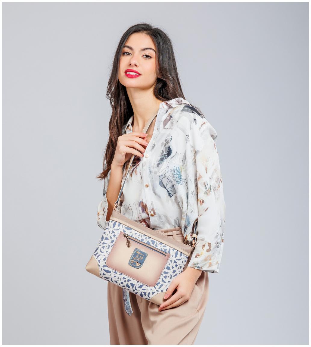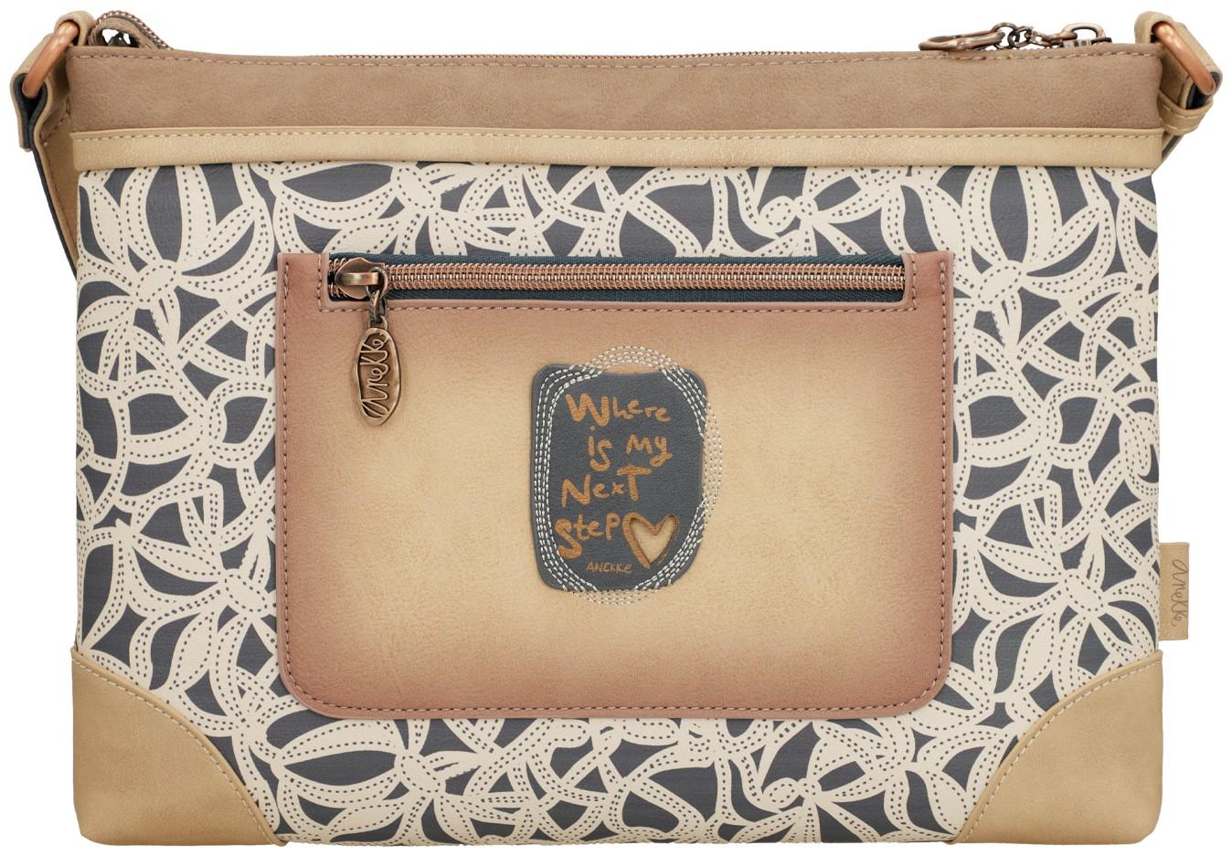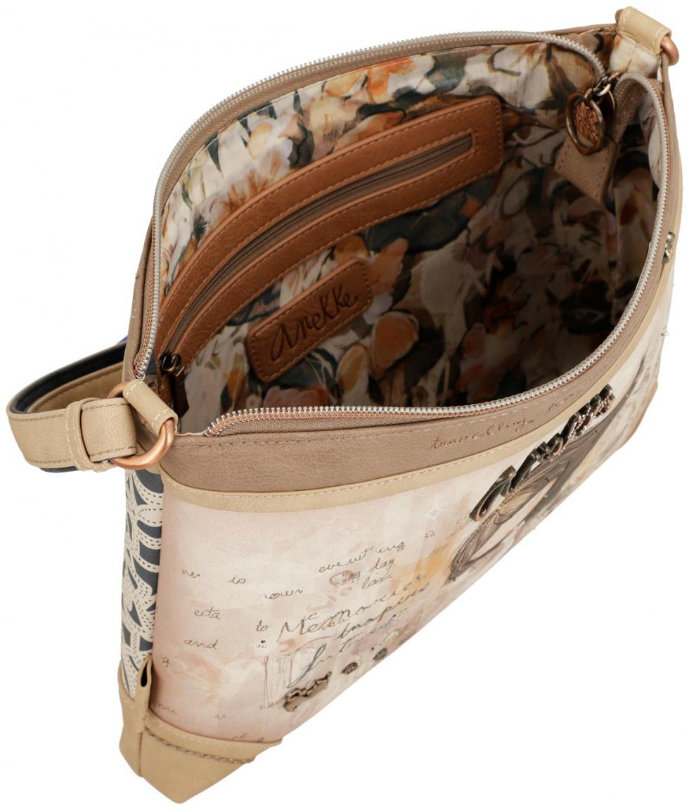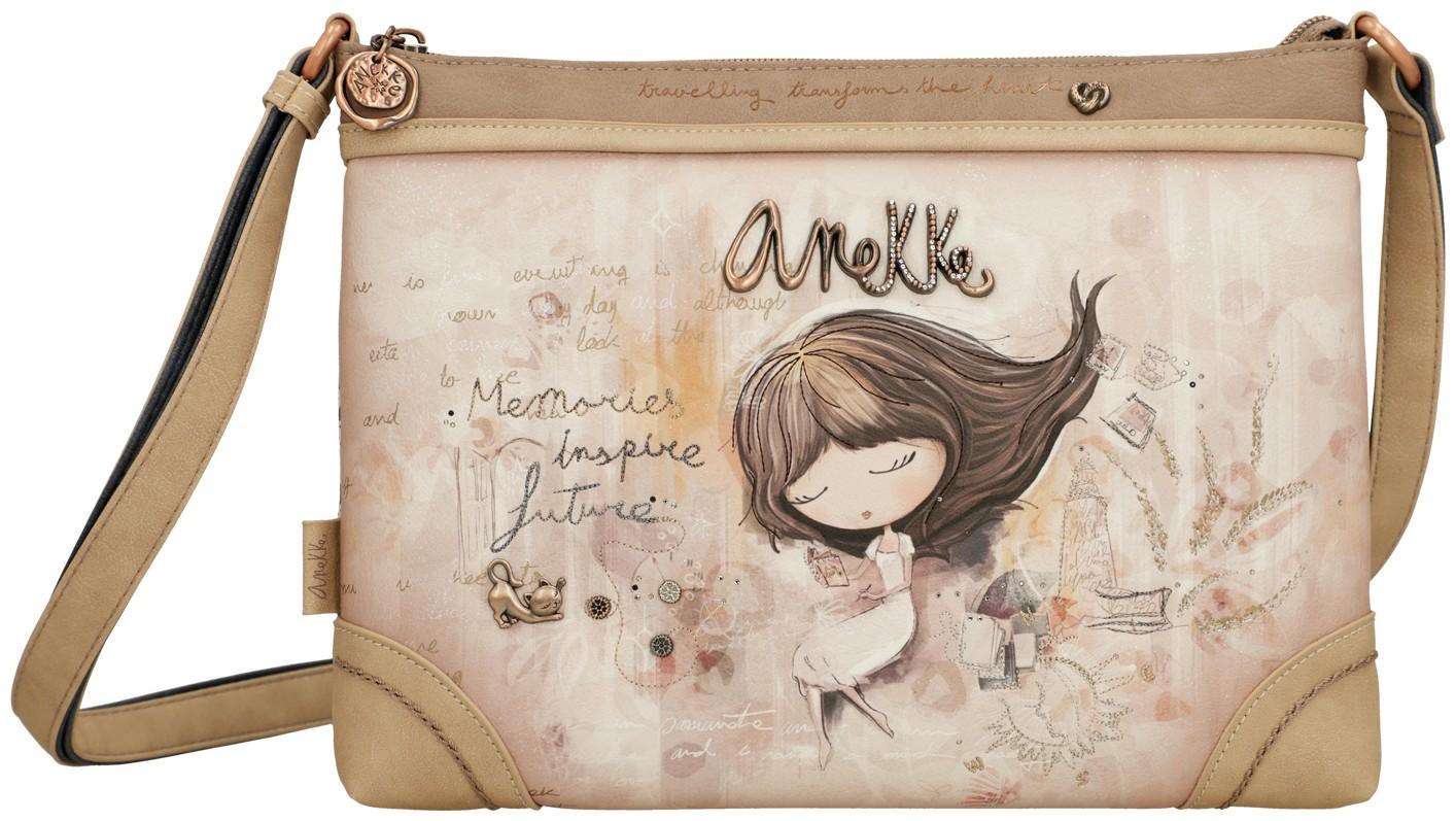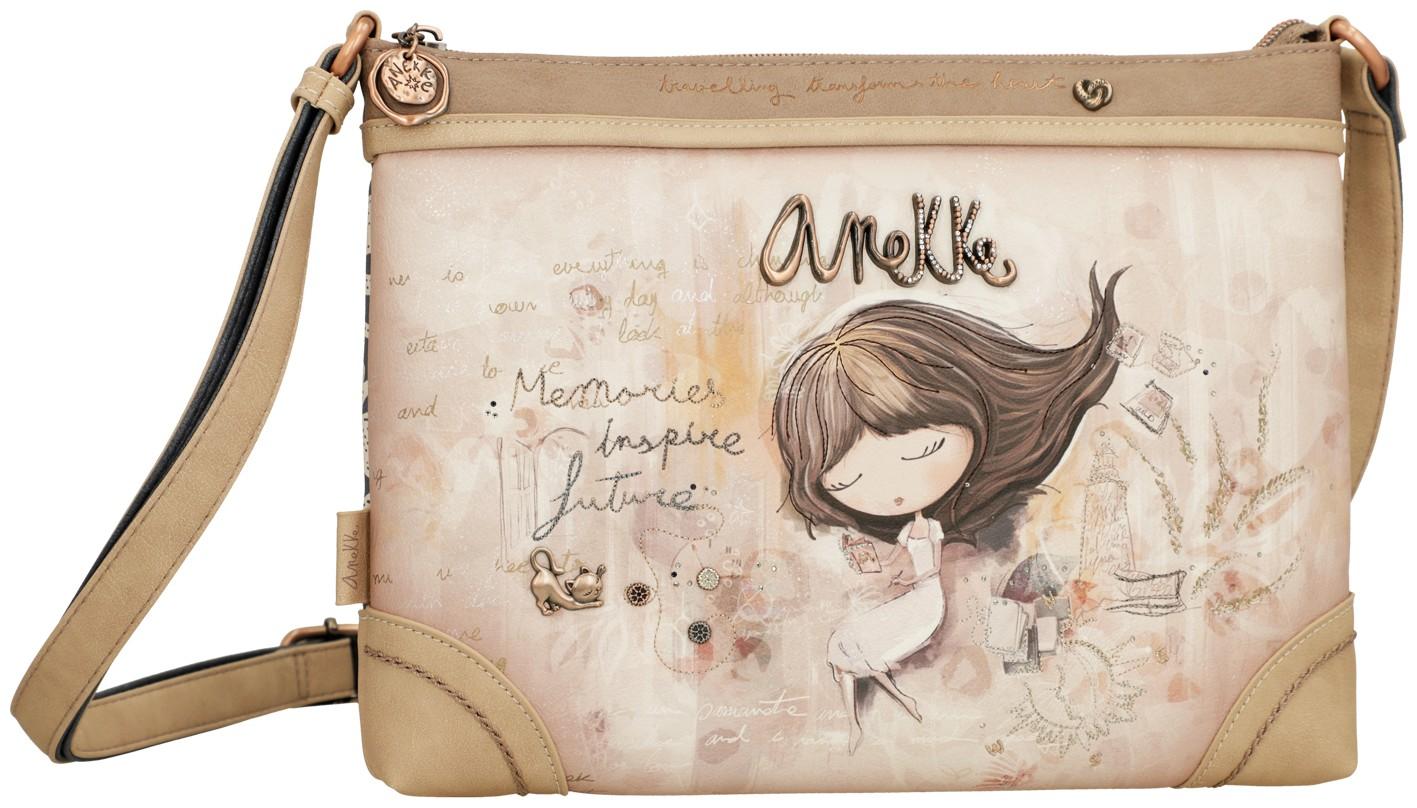 An der Vorderseite der Crossovertasche sehen wir den charakteristischen Print. Im Zentrum steht eine verträumte Anekke in Erinnerungen schwelgend. Glänzende Stickereien und funkelnde Strasssteine setzen das Motiv passend in Szene. Das Markenemblem passt sich dem fantasievollen Design der Schultertasche hervorragend an.