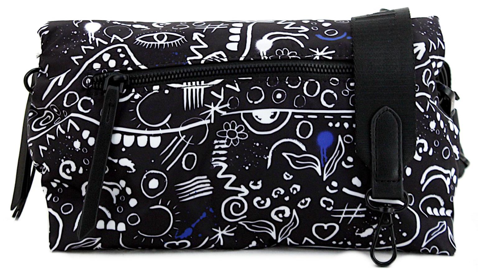 Ein echter Blickfang ist die Überschlagtasche Venecia Arteye. Die kompakte Schultertasche aus schwarzen Nylon ist mit weiß/blauen Motiven verziert. Das besonders robuste und vor allem leichte Material wird Gefallen finden.