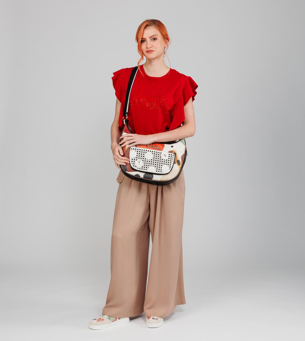 Wieder einmal gehen wir mit Anekke auf eine besondere Reise. Diesmal lädt sie uns mit der Kollektion Alma in ihr Heimatland Spanien ein. Diese Hobotasche aus der Linie Lunares zeichnet sich durch warme Farben und traditionelle Muster aus. Gefetigt ist die Schultertasche aus fein genarbtem Kunstleder mit abstraktem Print. Das aufgesetzte Reißverschlussfach an der Vorderseite zeigt ein regelmäßiges Muster mit gestanzten Polka Dots. Überlagert werden diese Punkte von größeren Kreisen, die durch kleine Ziernieten zusätzlich betont werden. Auch das silberfarbene Markenemblem fügt sich harmonisch in das Design der Beuteltasche ein.
