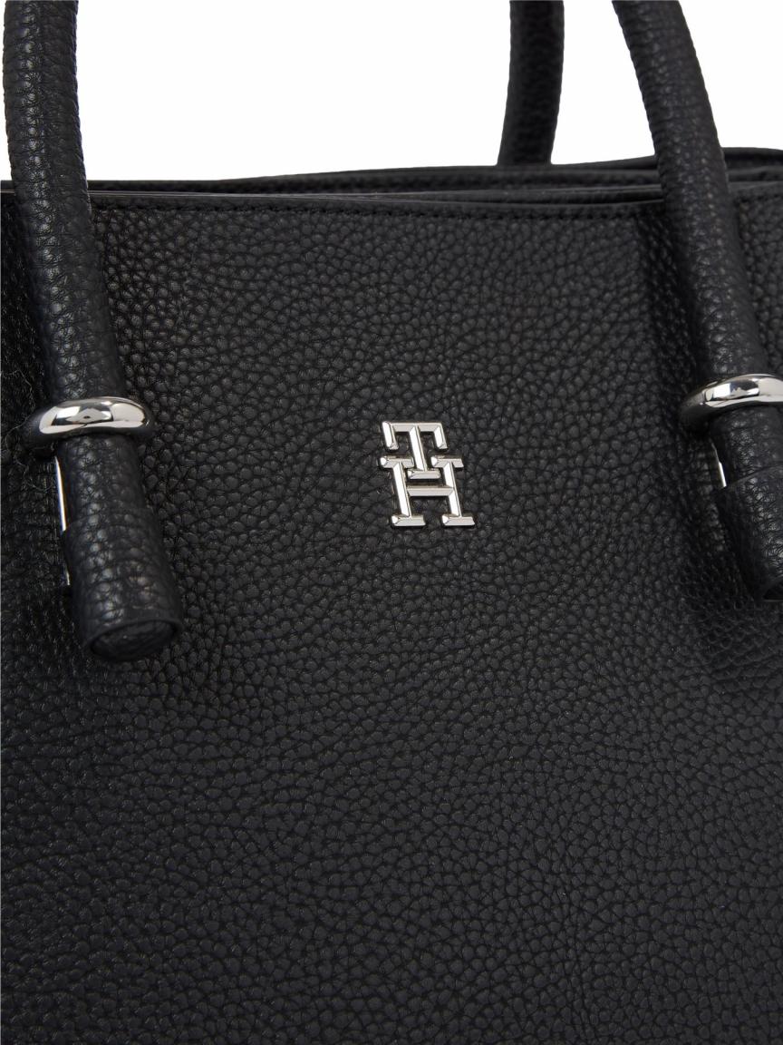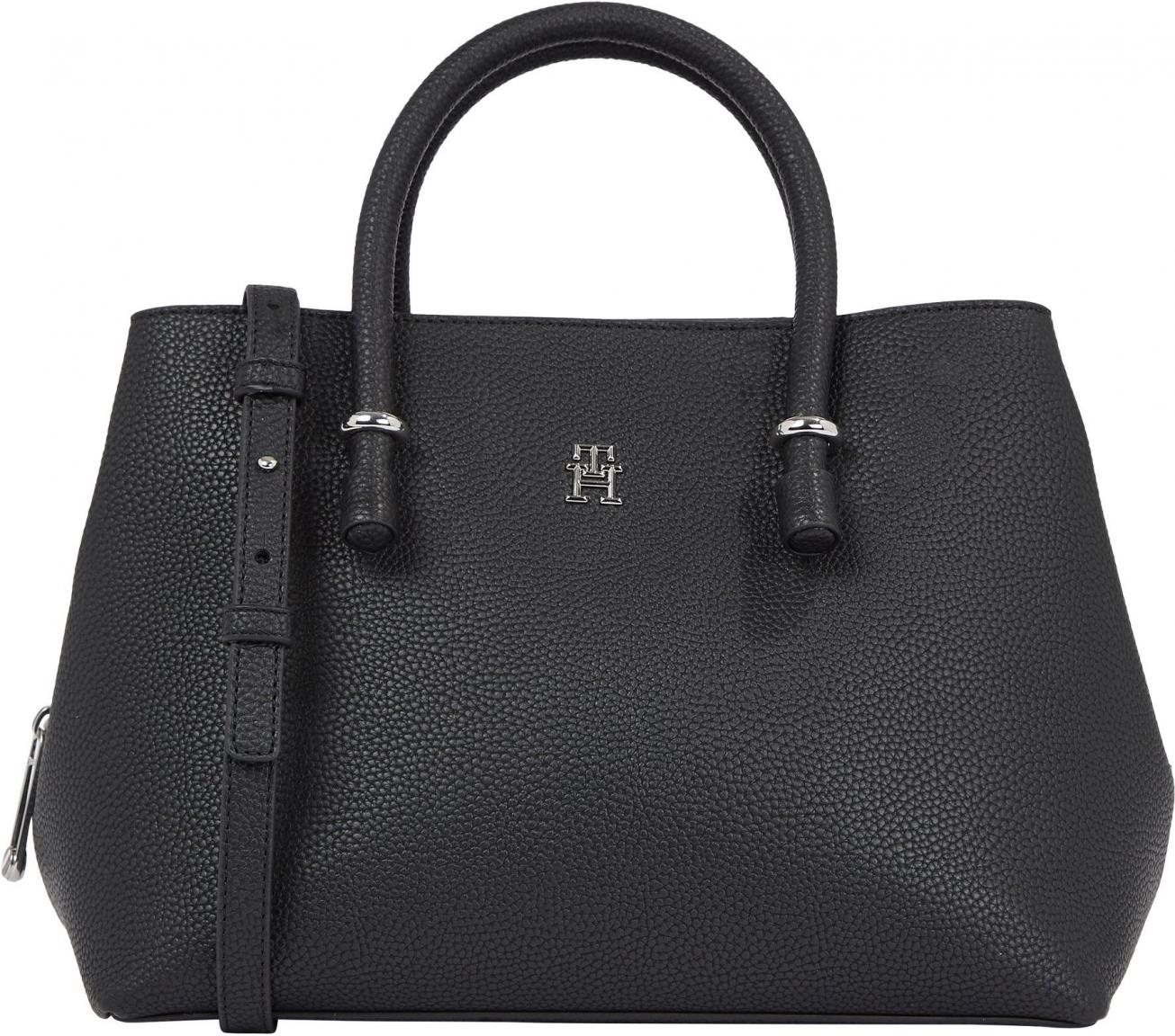 Mit der Kurzgrifftasche aus der Serie TH Emblem präsentiert uns Tommy Hilfiger eine ganz besondere Damentasche. Für das harmonische Design der Tasche wurde hochwertiges leicht genarbtes Kunstleder in Schwarz und silberfarbene Metallelemente miteinander kombiniert.