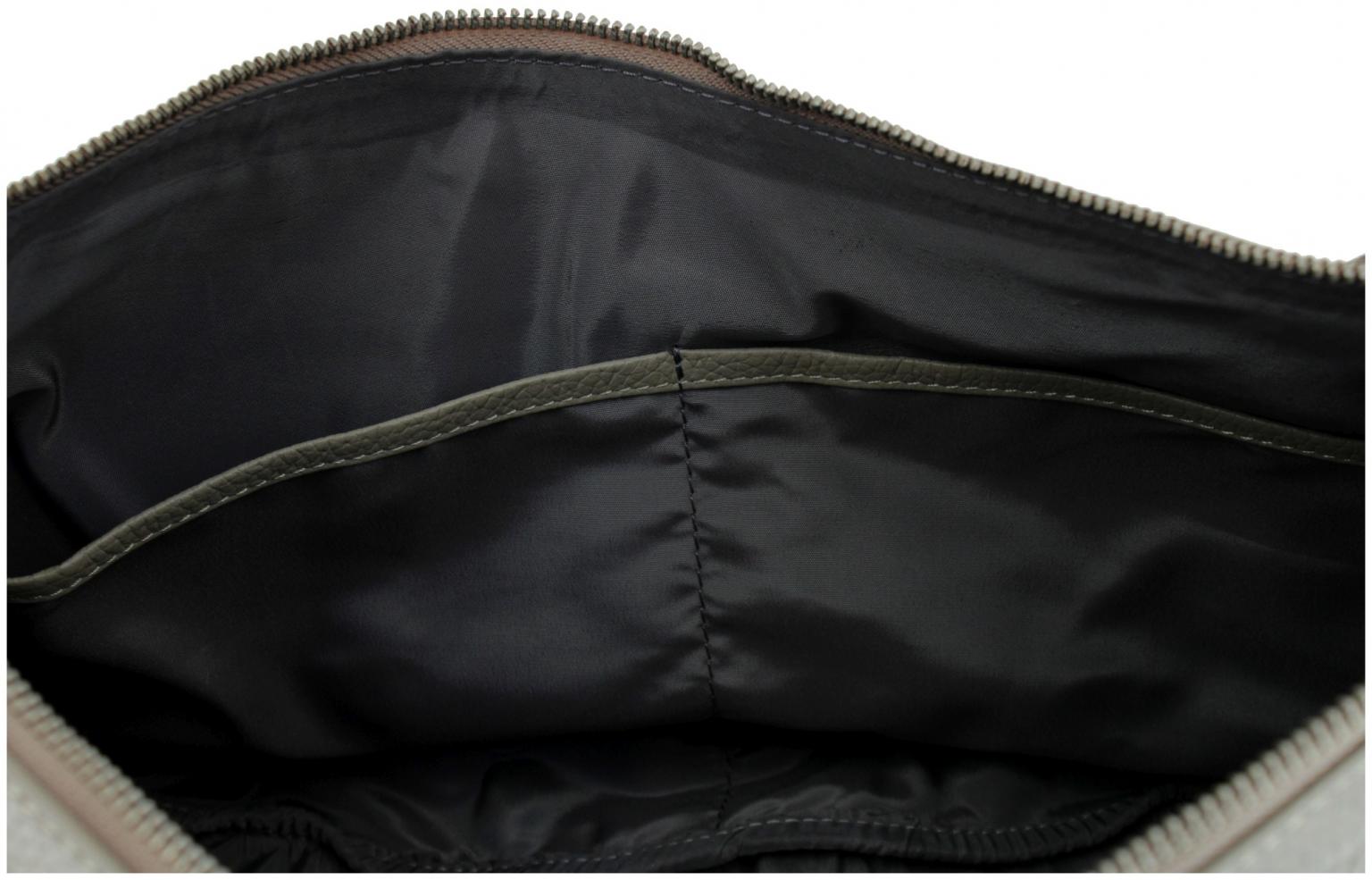 Das Hauptfach der Knautschtasche ist mittels Metallreißverschluss zu schließen. Im Inneren ist die Umhängetasche mit einem grauen Textilfutter ausgestattet.