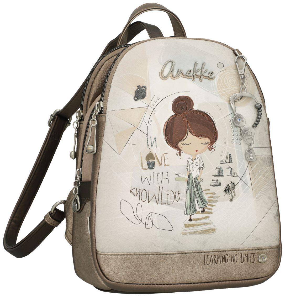 Der charakteristische Comicprint an der Vorderseite des Daypacks zeigt deshalb Anekke als selbstbewusste junge Frau, die souverän ihren Weg geht und sich nicht einschüchtern lässt - ein Vorbild für alle Mädchen und Frauen die Wissen lieben. Betont wird das Motiv durch zarte Stickereien und Applikationen am Citybackpack. Der Hintergrund ist in hellen Farbtönen gehalten und zeigt abstrakte, geometrische Formen mit silber- und goldglänzenden Akzenten. Umgeben von Büchern und Schriftrollen des antiken Griechenlands.