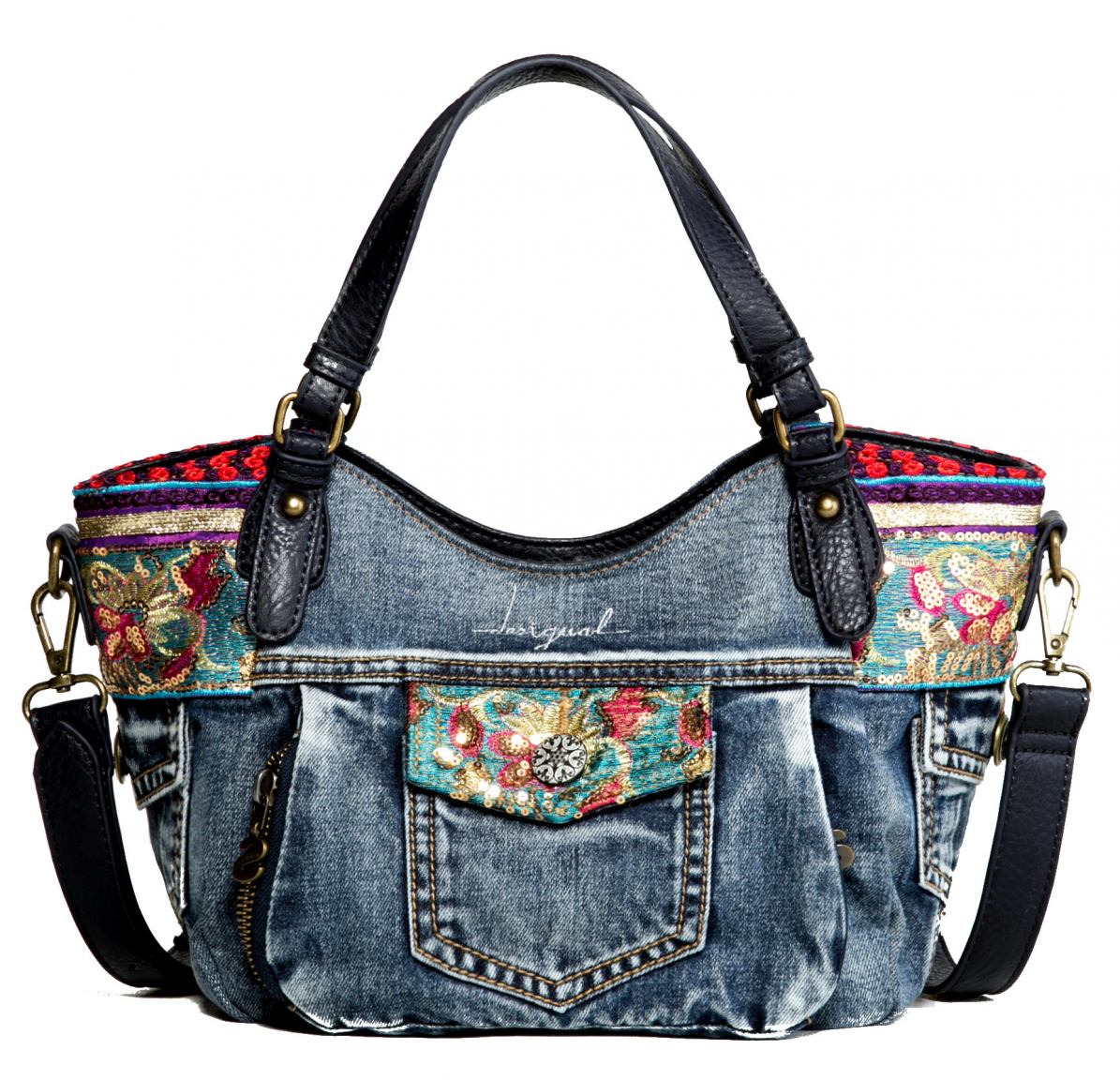 Die Shoppertasche Rotterdam aus der Serie Ethnic Deluxe von Desigual ist aus besticktem Jeansgewebe kombiniert mit Kunstleder gefertigt