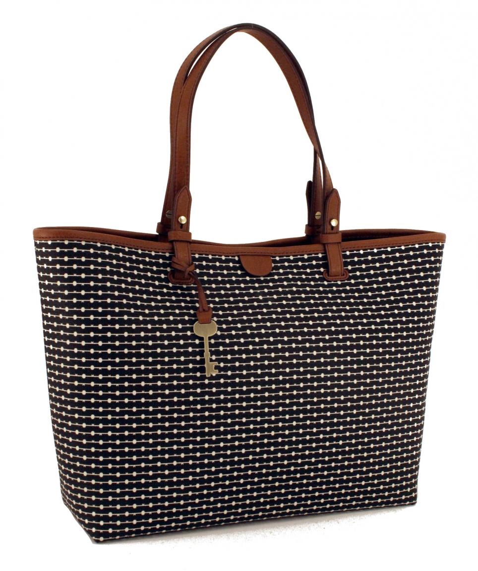 Die Shoppertasche Rachel Tote aus der Serie Black Stripe von Fossil ist aus hochwertigem Kunstleder mit Henkeln und Applikationen aus Rindleder gefertigt.