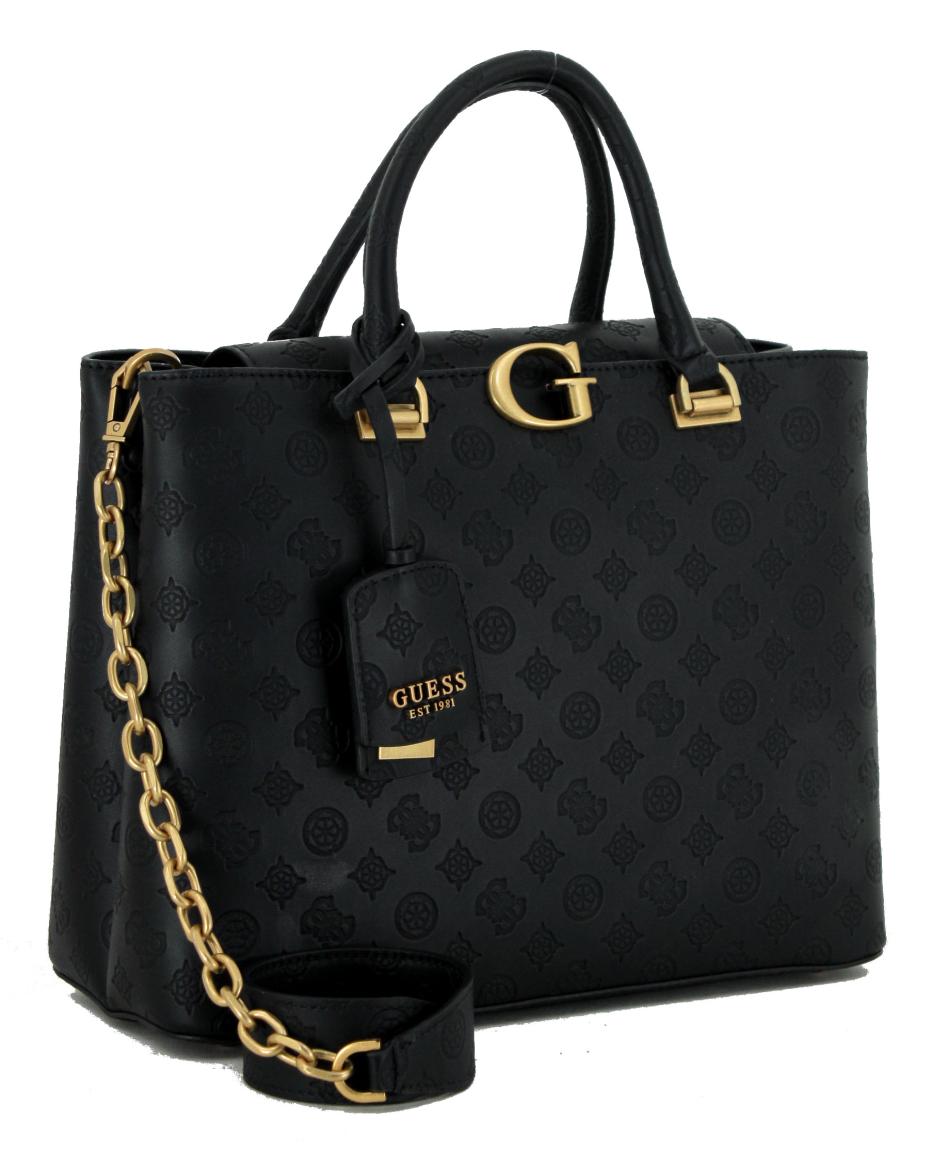 Eine angesagte Alloverprägung zeichnet diese Kurzgrifftasche aus der Serie G Vibe von Guess aus. Messingfarbene Metallelemente im Vintagestil sorgen hierbei für einen aufregenden Kontrast zum schwarzen Lederimitat der Handtasche.