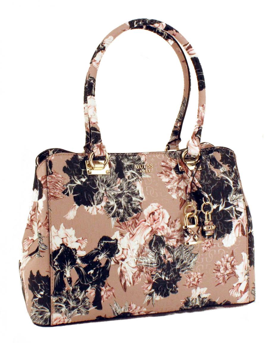 Die feste, glänzende Kunstleder-Oberfläche in rosa mit schwarz-weissem Blumenaufdruck ist strukturiert mit Prägungen des Guess-Symbols, dadurch ist die Tasche unempfindlicher und strapazierfähiger.