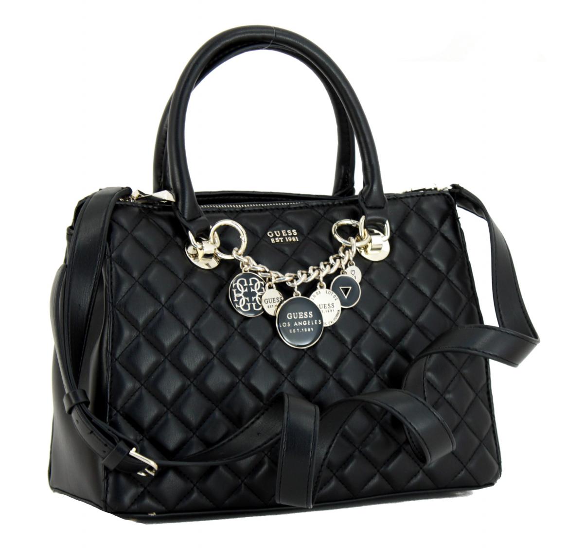 Diese Kurzgrifftasche aus der Serie Victoria von Guess ist aus hochwertigen Materialien gefertigt. Sie besticht durch die angesagte Stepp-Optik und die goldfarbenen Metalldetails. Ein besonderer Eyecatcher ist die Kette an der Vorderseite, an der verschiedene Anhänger befestigt sind. Diese Kette kann jedoch auch problemlos abgenommen werden.