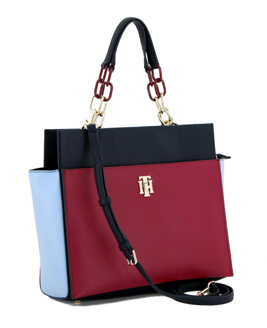 Die Handtasche Satchel aus der Serie TH Saffiano von Tommy Hilfiger ist aus hochwertigem Saffiano-Lederimitat in einem Beerenton, hellblau und dunkelblau gefertigt.