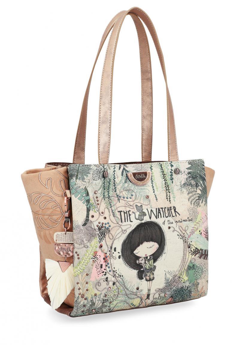 Die Henkeltasche aus der Serie Anekke The Watcher ist der perfekte Alltagsbegleiter für alle Naturfreunde. Zarte Stickereien und bunte Blätter an der Vorderseite der Handtasche erinnern an den tiefsten Dschungel. Der comicartige Print mit Anekke und dem Affen betont das exotische Design der Henkeltasche. Ziernieten und Glitzersteine verleihen der Handtasche eine einzigartige Ausstrahlung.