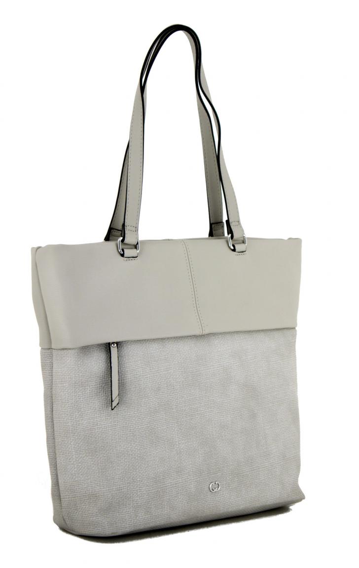 Der Shopper LVZ aus der Serie Keep in Mind von Gerry Weber ist aus hochwertigem Lederimitat in hellem Grau gefertigt. Der untere Teil der Tasche ist in grober Leinwandoptik strukturiert.