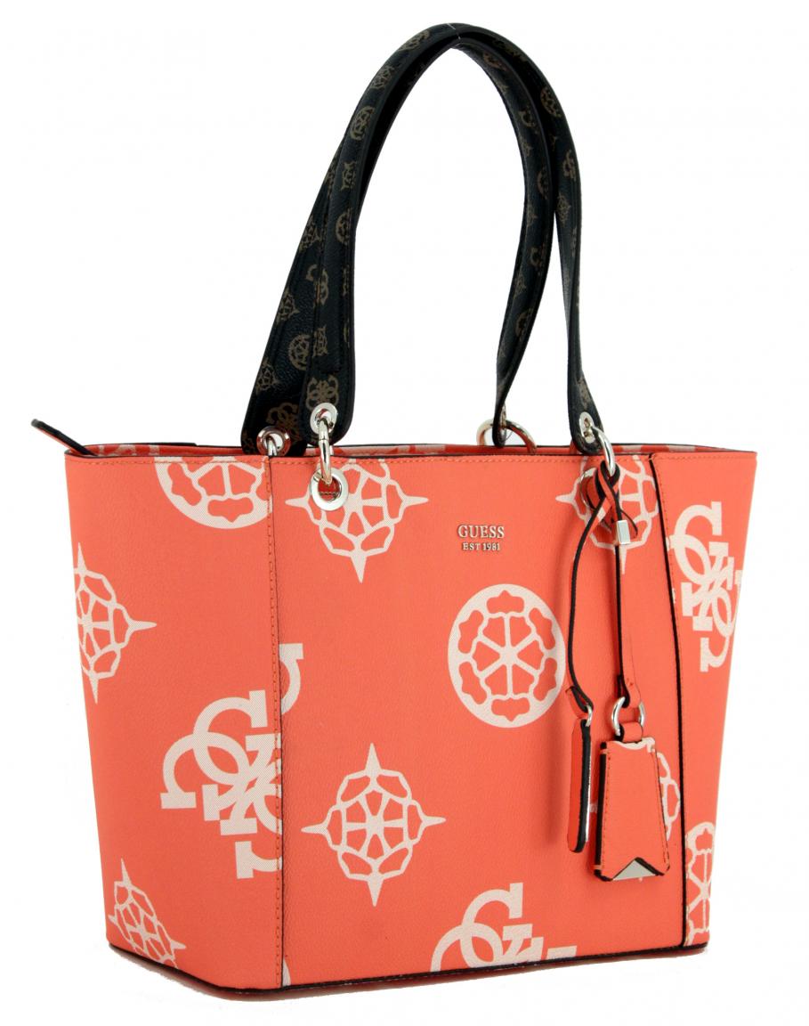 Die Henkeltasche aus der Serie Kamryn der Marke Guess ist aus hochwertigen Materialien mit groß gemusterer Oberfläche in der Farbe Orange Multi (orange/beige gemustert) gefertigt. Eine extravagante Tasche in einer starken Farbe für unvergessliche Auftritte.