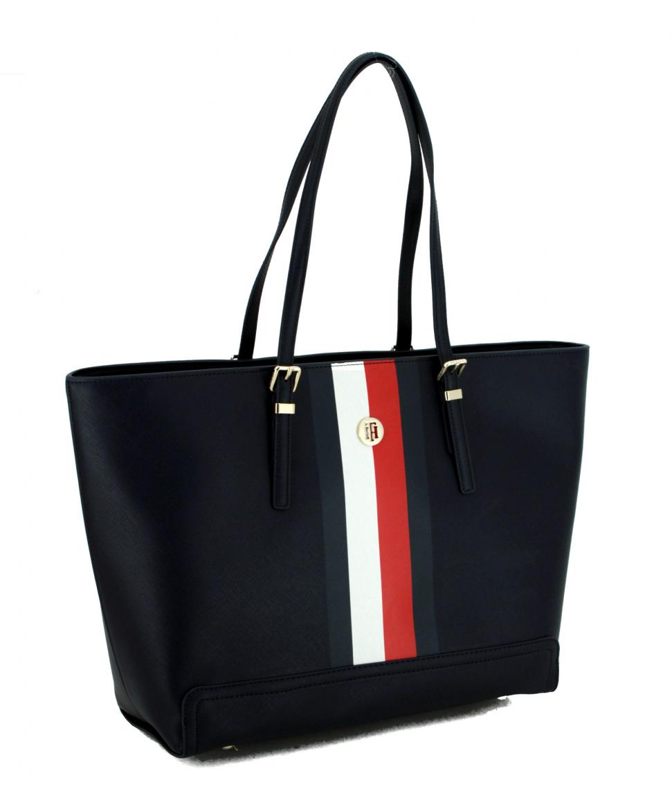 Die Henkeltasche EW Tote von Tommy Hilfiger aus der Serie Honey ist aus hochwertigem strukturiertem Lederimitat gefertigt. Durch die Streifen in den Farben rot, weiß und blau erhält die dunkelblaue Tasche das typische Hilfiger-Design.