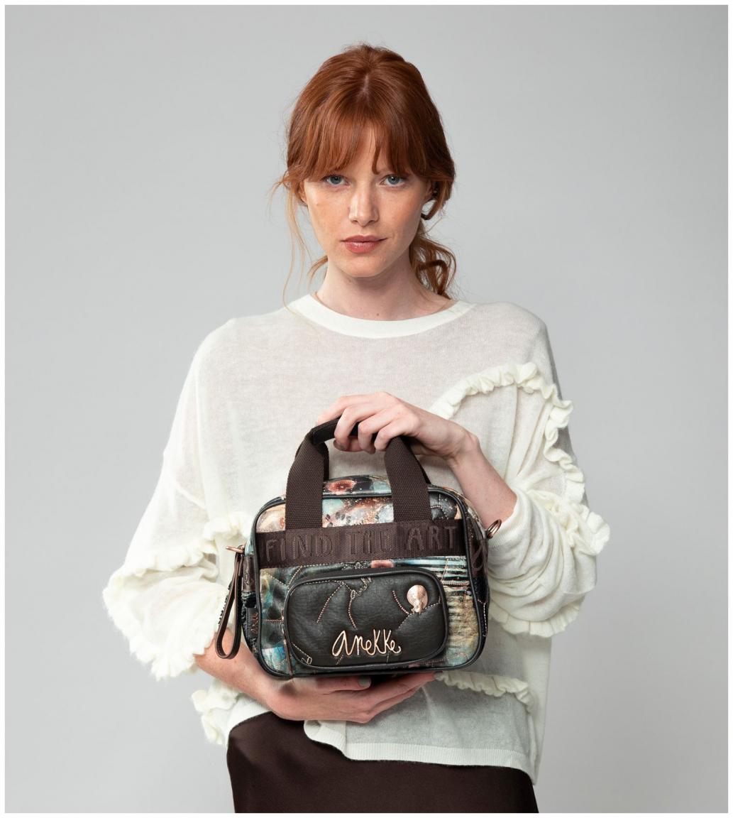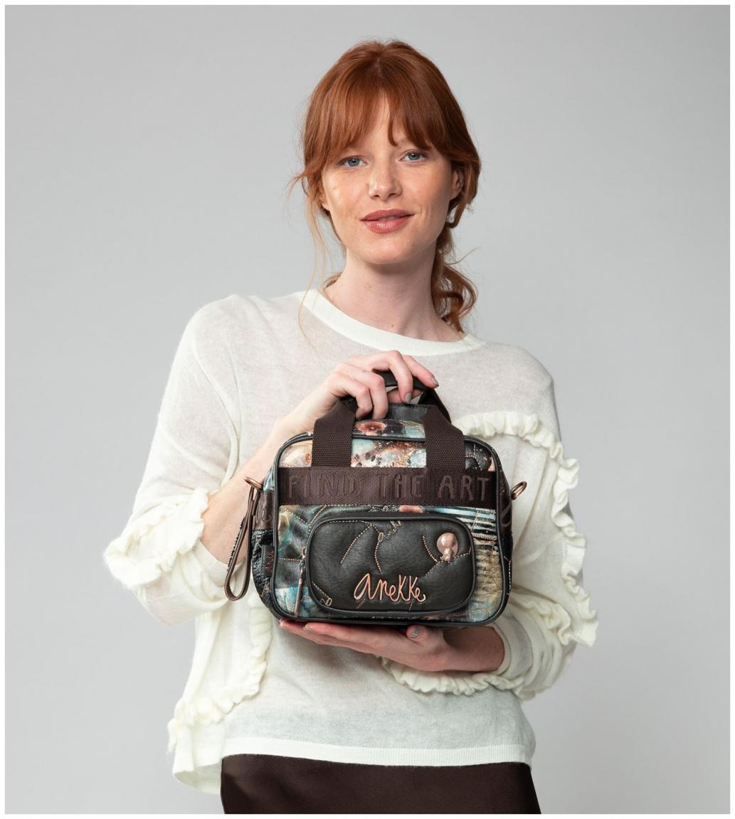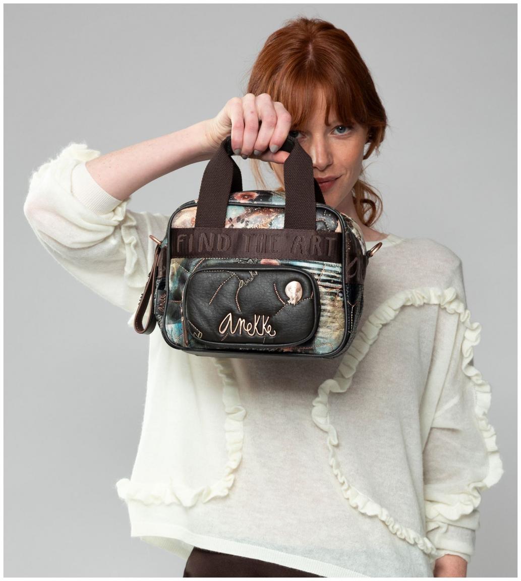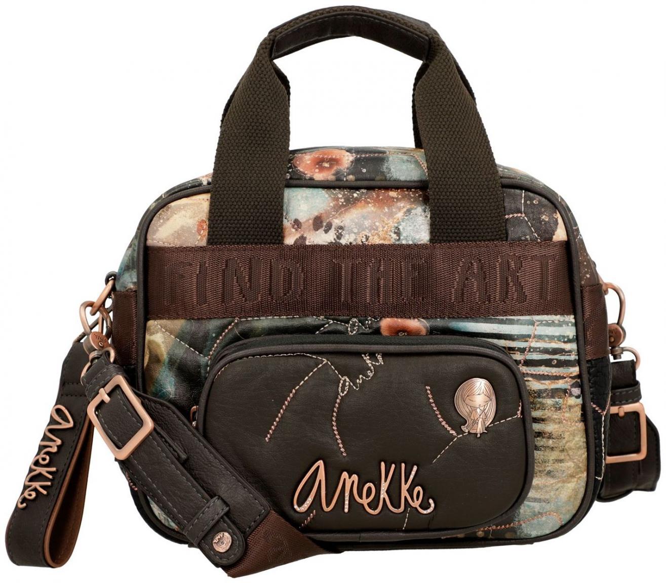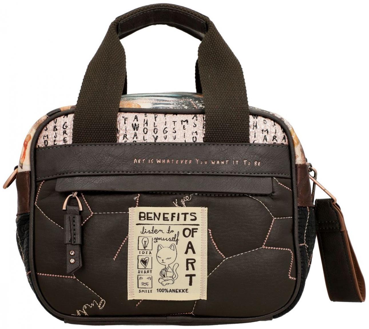 Die Vorderseite der Tote Bag zeigt einen abstrakten Kunstdruck mit Blüten auf glattem Kunstleder. Das braun gewebte Gurtband mit Statement animiert uns dazu, selbst kreativ zu werden. Auf dem aufgesetzten Reißverschlussfach aus braunem Kunstleder finden wir einen geschwungenen Markenschriftzug sowie eine Metallapplikation von Anekke als Künstlerin.