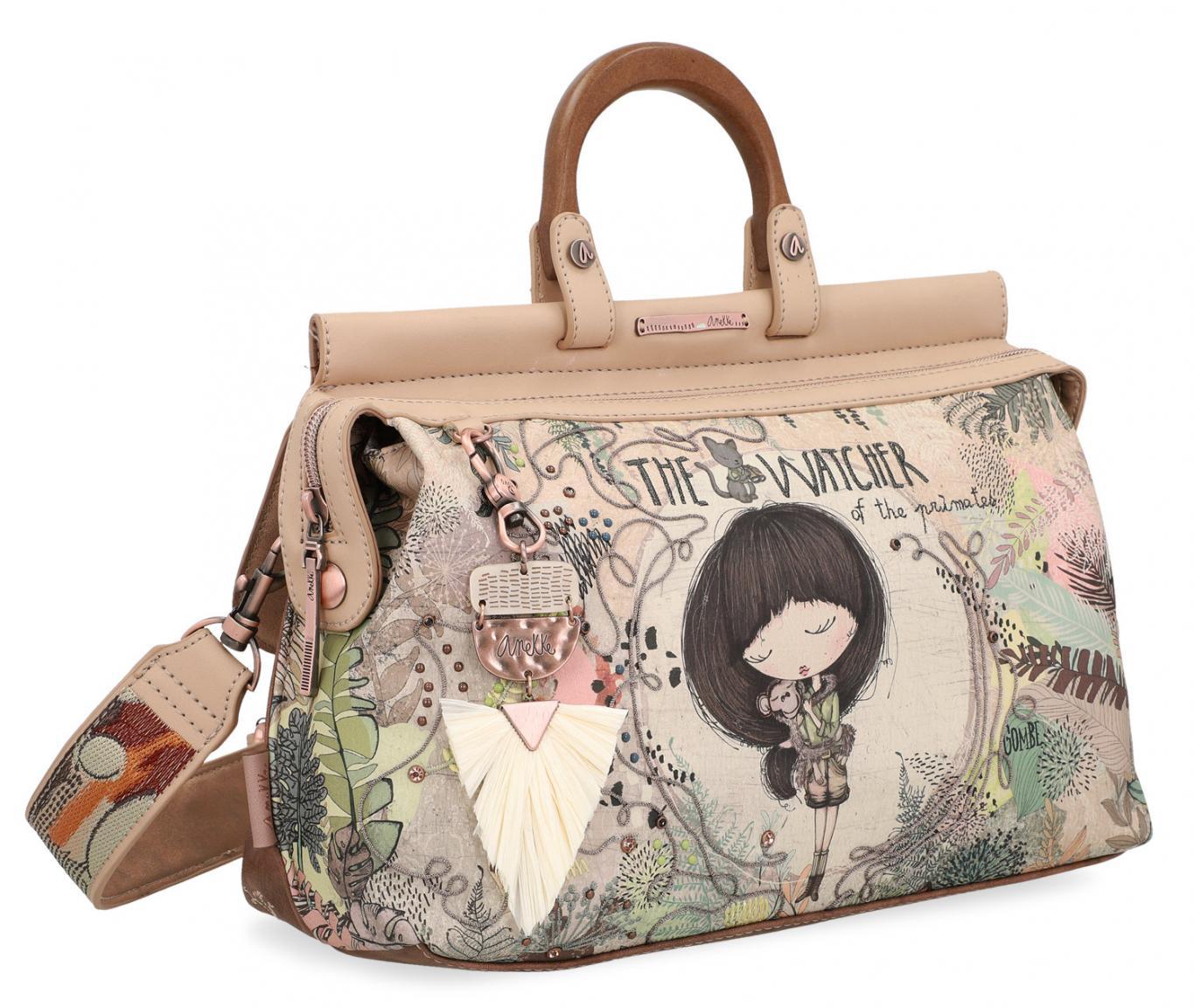 Ein ganz besonderer Begleiter ist diese Kurzgrifftasche aus der Serie Jungle The Watcher von Anekke. Die außergewöhnliche Top Handle Bag besticht durch den niedlichen Print mit Mädchen und Affe an der Vorderseite. Exotische Blätter und zarte Stickereien erinnern an geheimnisvolle Dschungellandschaften. Ziernieten und Glitzersteine betonen das ungewöhnliche Design der Kurzgrifftasche hervorragend.